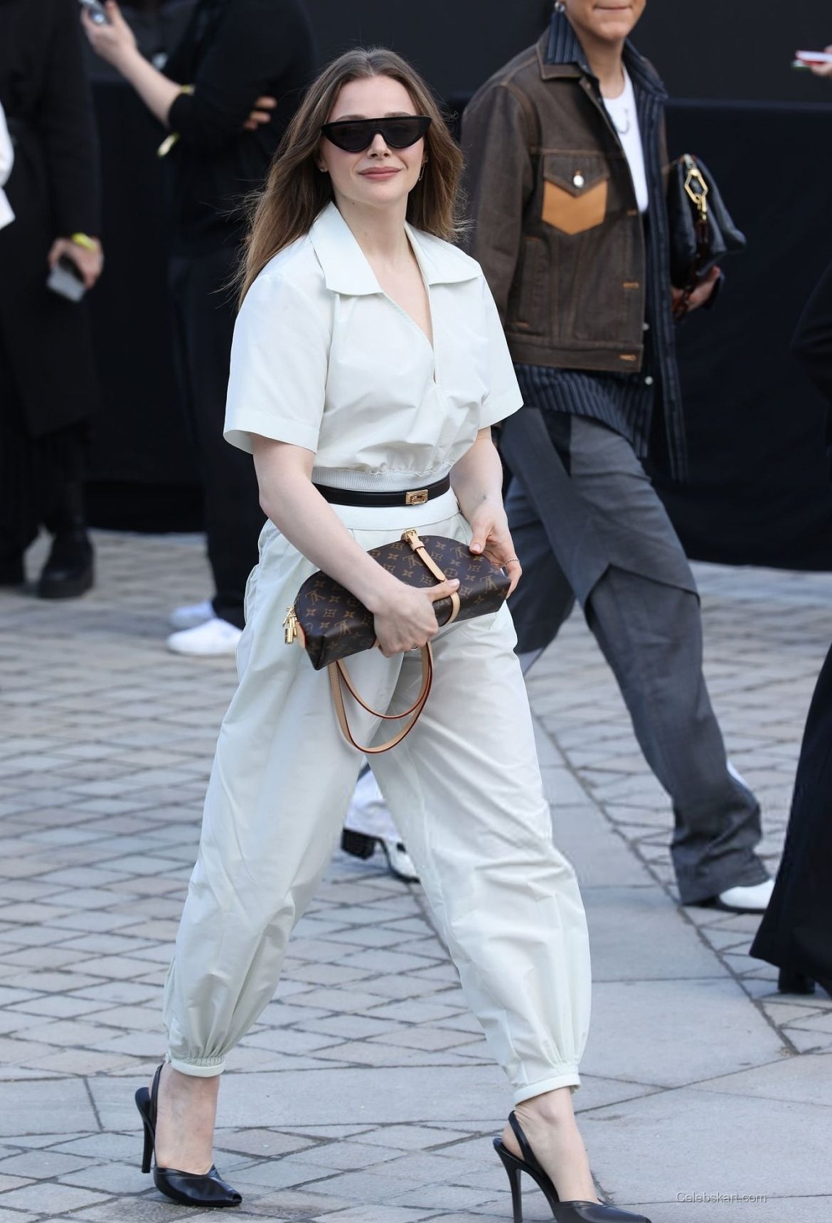 Dressed in a striking white jumpsuit, Chloe's outfit featured a deep v-neck that added a hint of sophistication. The jumpsuit was cinched at the waist with a sleek black belt, seamlessly blending comfort and style. With the ensemble, she carried a classic Louis Vuitton handbag, featuring its iconic monogram signature, which tied the whole look together beautifully. This modern yet relaxed attire was complemented by pointed black heels that added a touch of class. For more photos of Chloe Moretz's fashion, check here.
