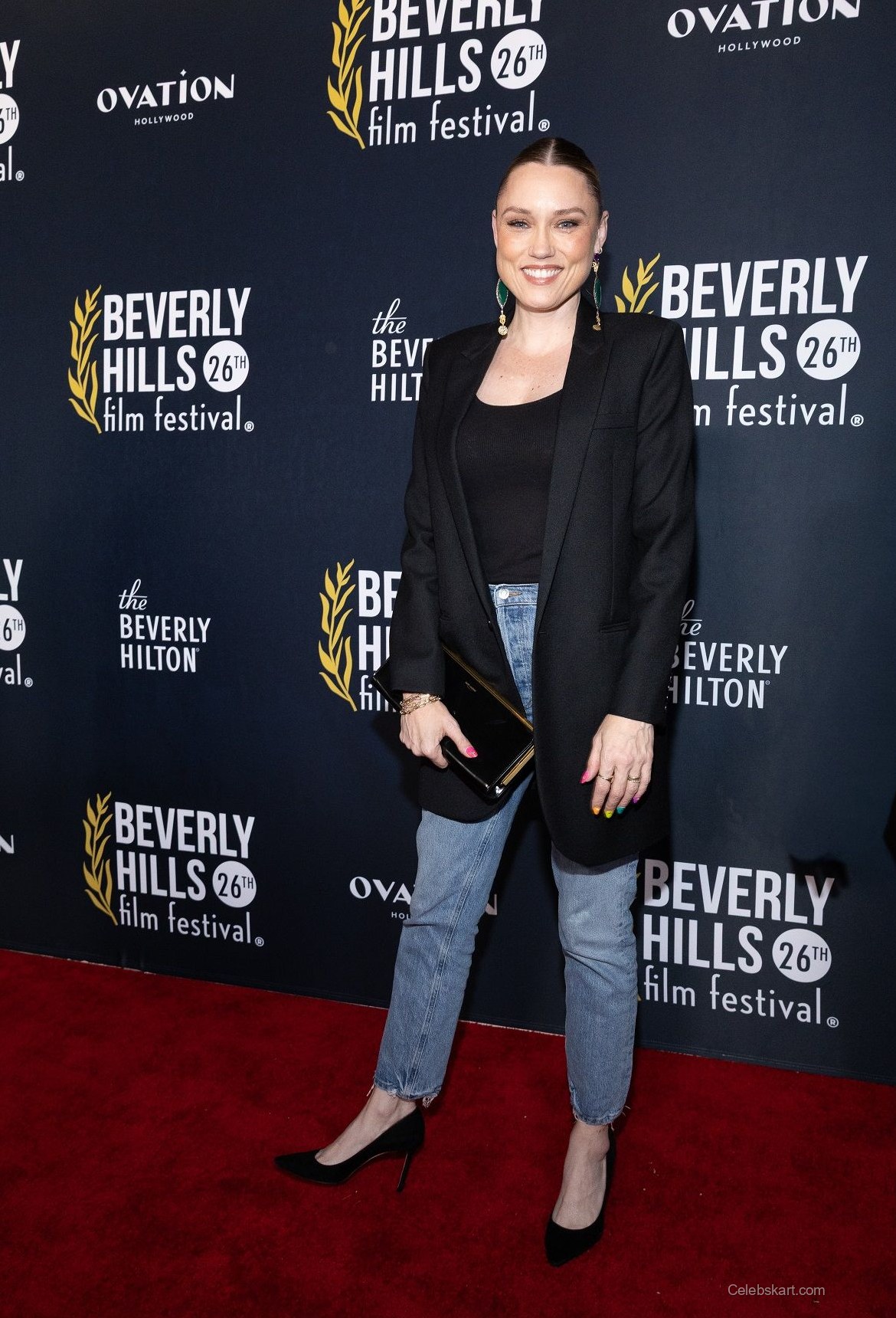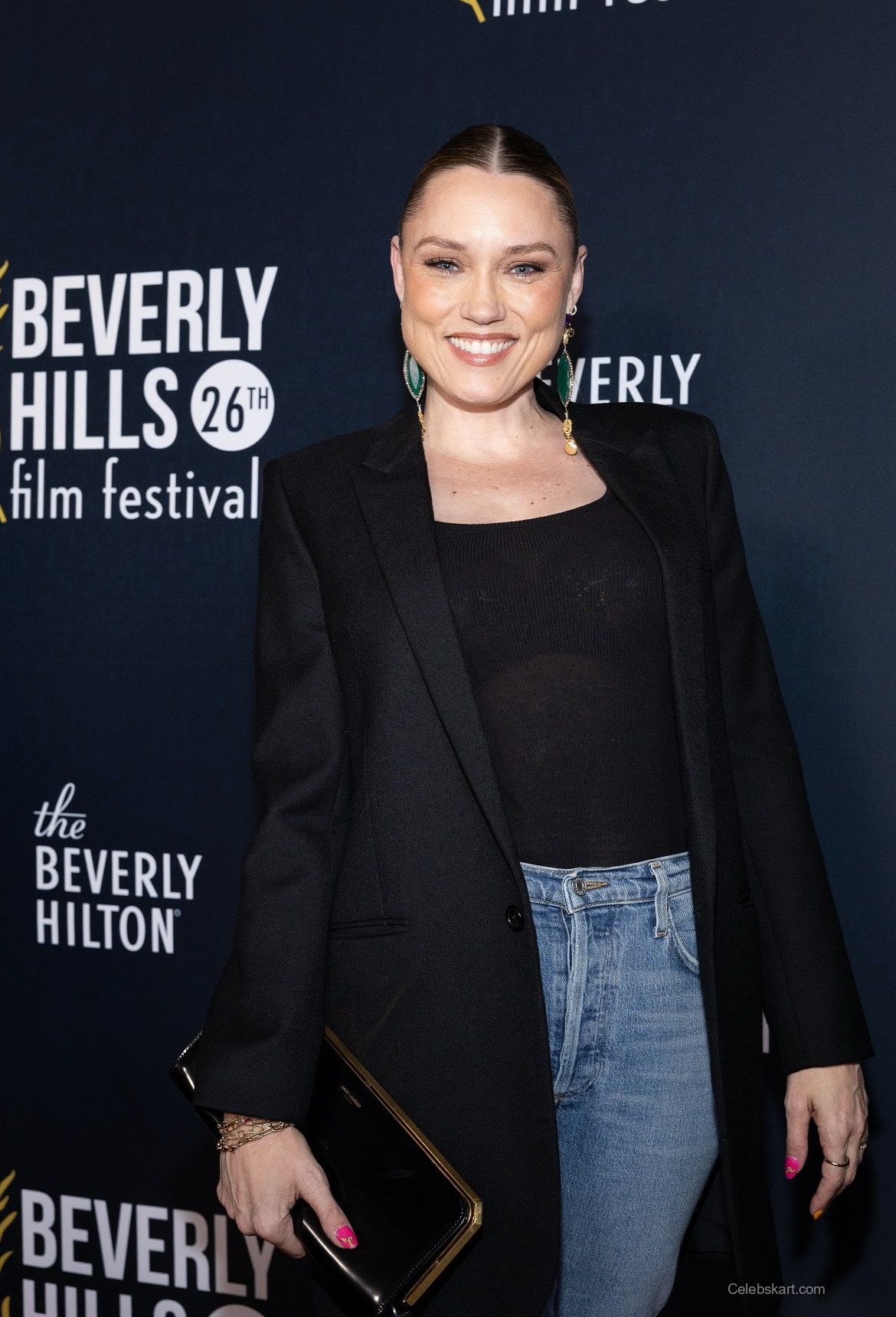 Clare's outfit featured a black blazer that added a polished touch to her ensemble. The fitted black tank top underneath highlighted her figure, while the high-waisted denim jeans provided a relaxed yet trendy vibe. Accessorizing with a sleek black clutch and eye-catching green earrings, Clare's look was both elegant and stylish. The combination of the structured blazer and casual jeans created a harmonious balance that made her stand out on the red carpet.
