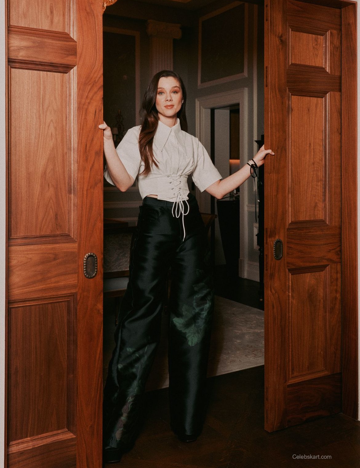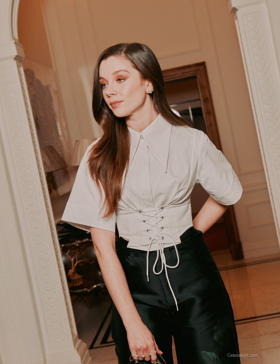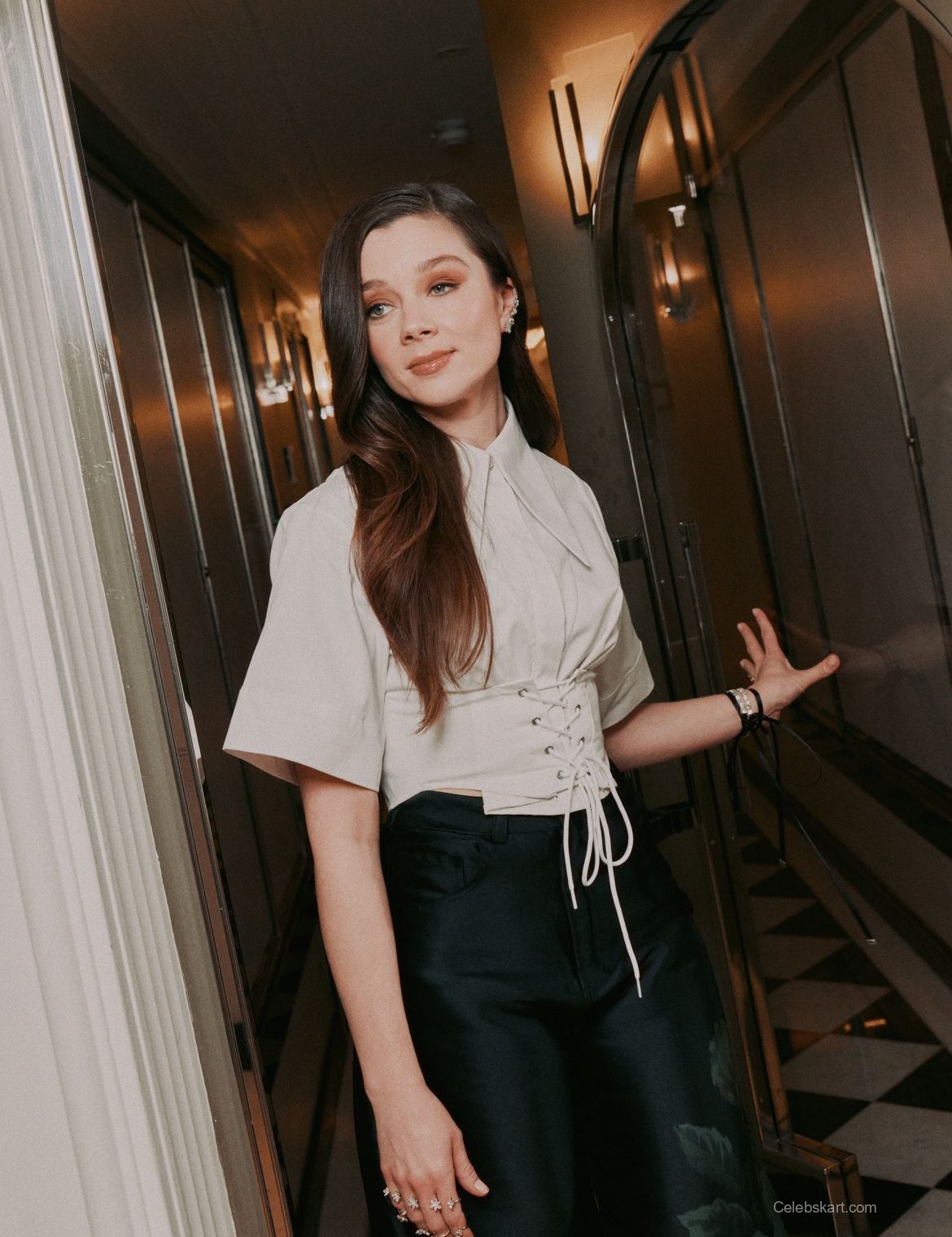 Her ensemble features a striking light gray top complemented by chic black satin trousers. The lace-up detail at the waist gives the outfit a playful yet elegant look. The soft fabric of her top contrasts well against the silky sheen of her pants, creating a balanced silhouette. Claudia’s choice of jewelry, including multiple sparkling rings, adds a touch of glamour.