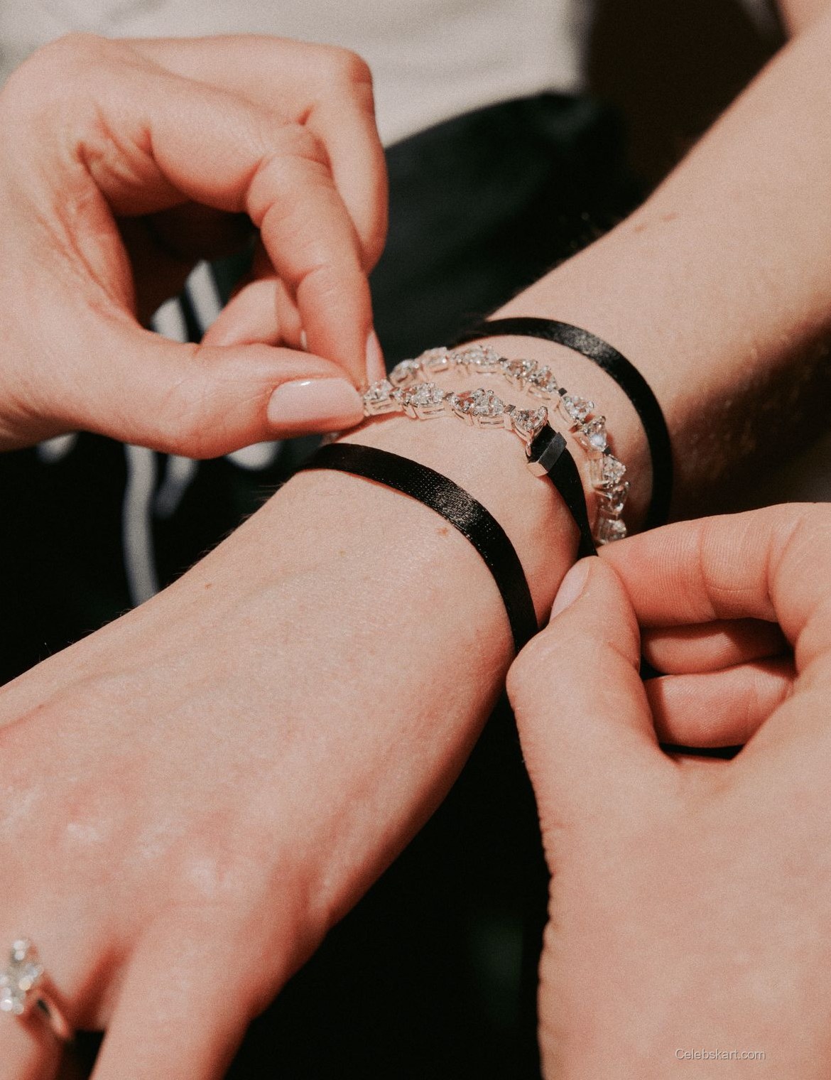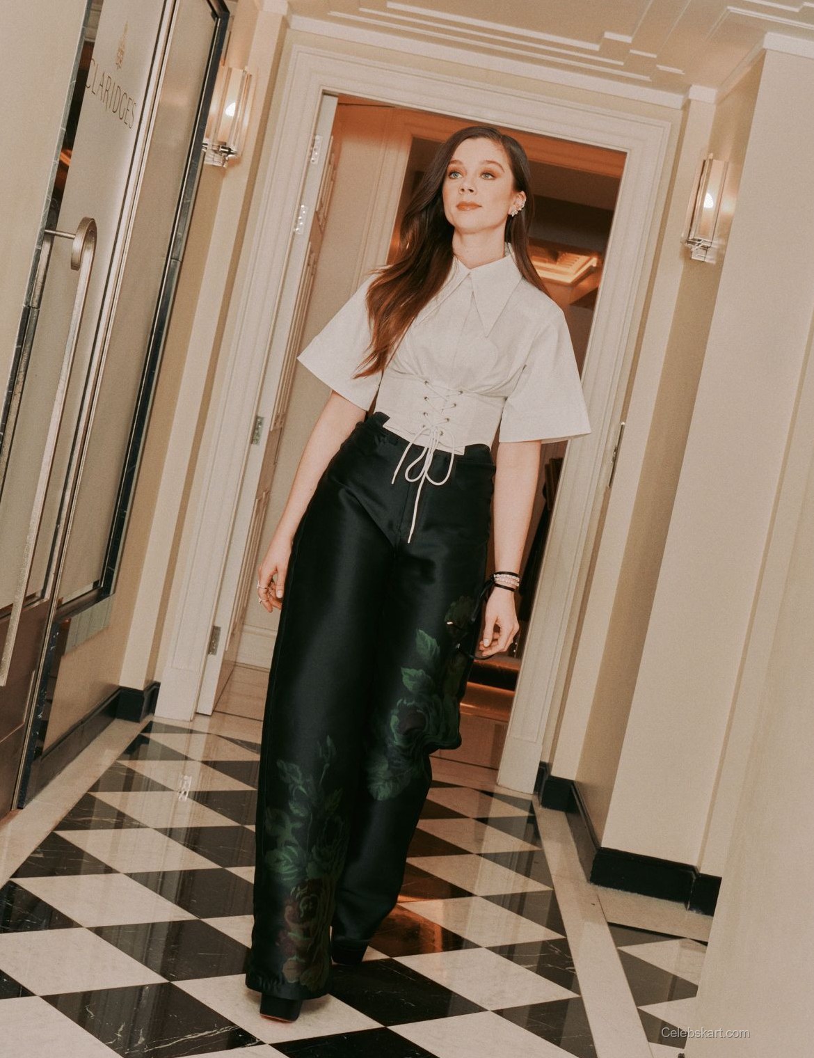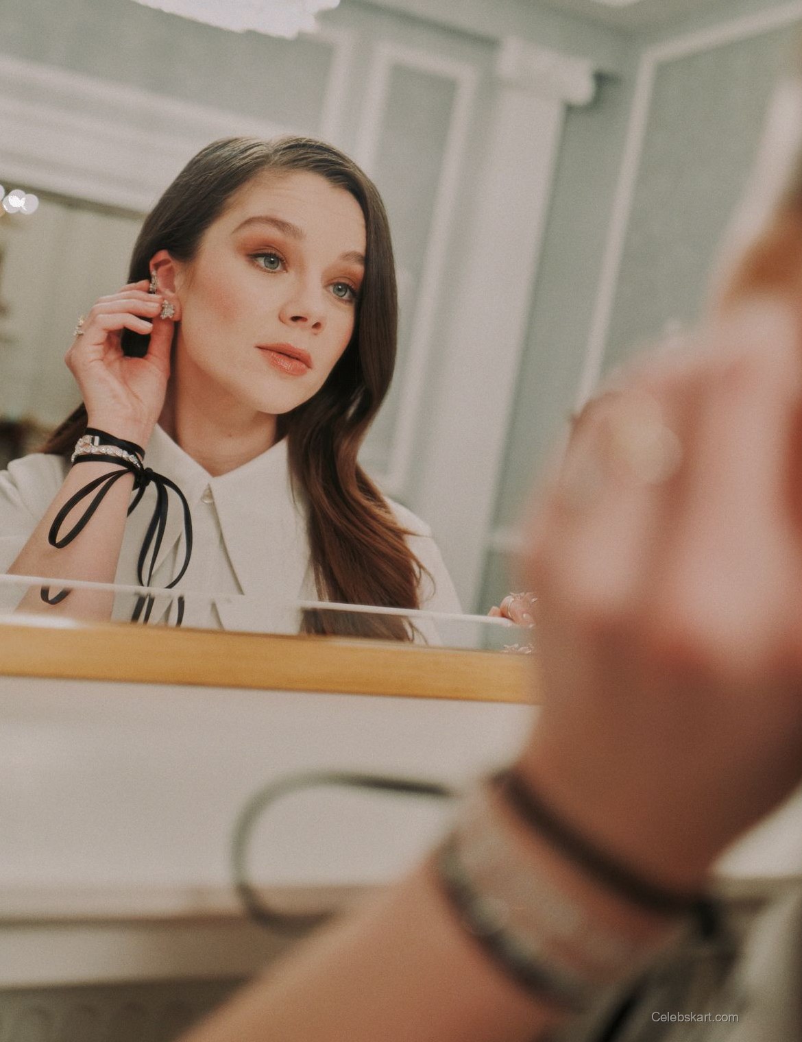 Posing thoughtfully, Claudia exudes confidence in her look. The backdrop of the room, adorned with soft lighting and elegant decor, enhances the overall aesthetic. As she adjusts her accessories, the intricate details of her outfit become the focal point, showcasing her keen fashion sense. That moment captures her effortlessly engaging with the stylist while adding a bracelet, emphasizing the collaborative nature of fashion.