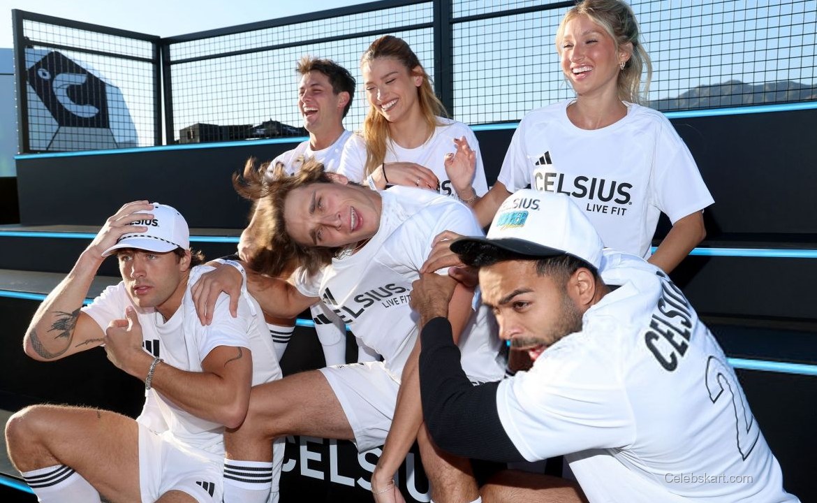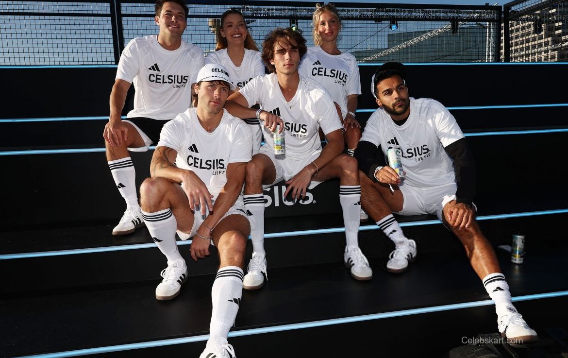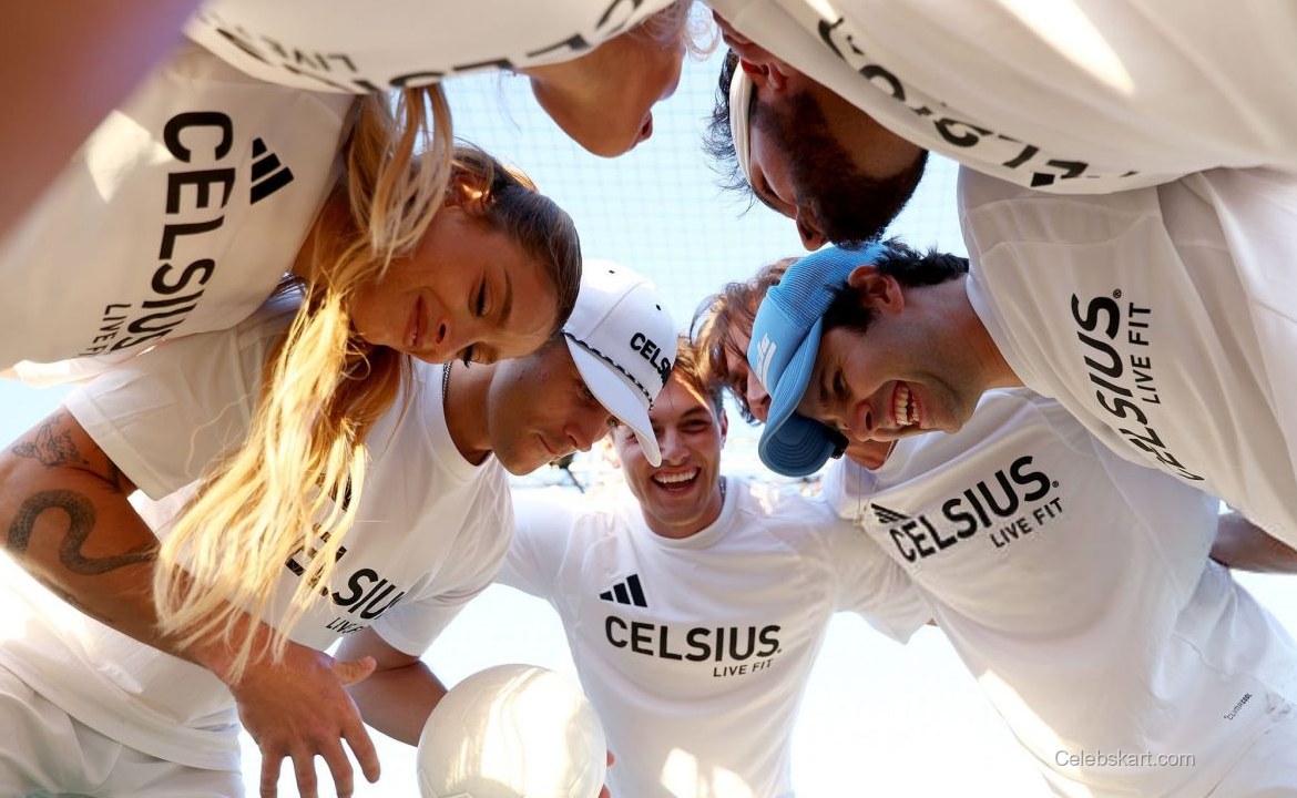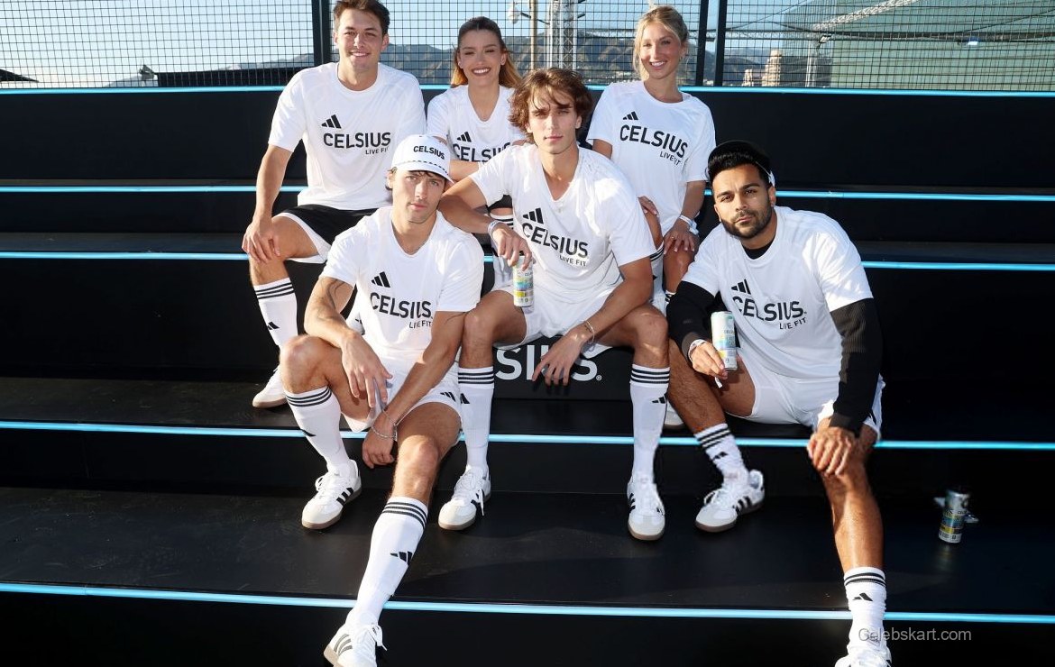 Her outfit featured a crisp white t-shirt emblazoned with the CELSIUS logo and matching athletic shorts, creating a cohesive and sporty look. The ensemble was complemented by high-top white sneakers, adding a touch of modern flair to her athletic appearance. This choice of outfit was not only stylish but also functional, allowing her to engage comfortably in the activities surrounding the event.