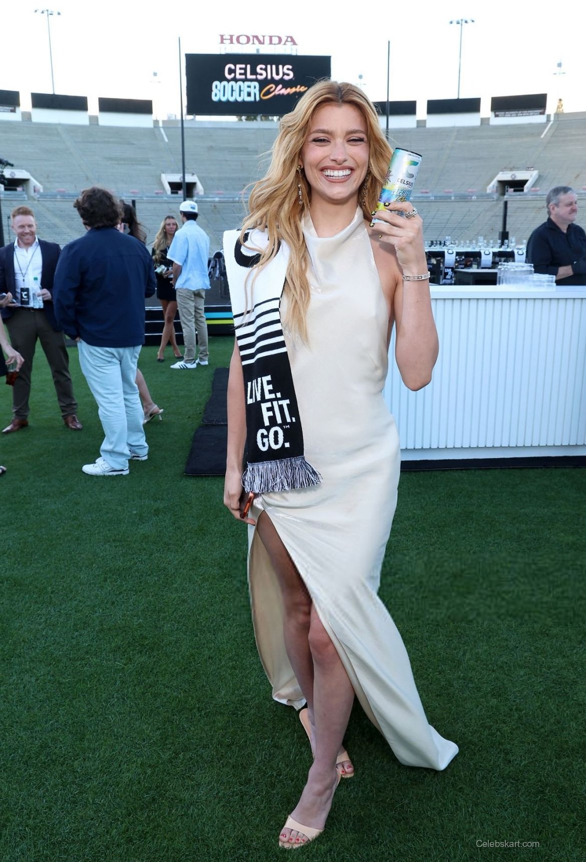 As Dixie walked through the venue, her long, wavy hair flowed , framing her face beautifully. She exuded confidence, often flashing her trademark smile at the cameras. The backdrop of the Rose Bowl, with its vibrant atmosphere and buzzing crowd, added to the excitement of the evening. Dixie’s demeanor reflected the celebratory tone of the event, making her one of the standout guests.