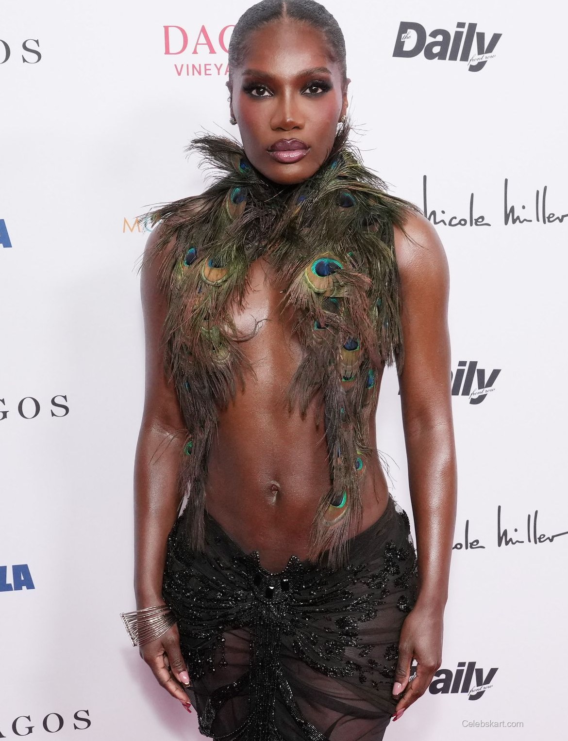 DOECHII wore an extraordinary outfit that featured a feathered bodice adorned with peacock feathers, adding a vibrant touch to her ensemble. The bodice was complemented by a sheer black skirt that flowed elegantly to the floor, adorned with intricate beadwork. The combination of textures and details created a mesmerizing visual effect, making a strong impression on all attendees. Her silver jewelry, including a statement bracelet, added an extra layer of sophistication to the overall look.