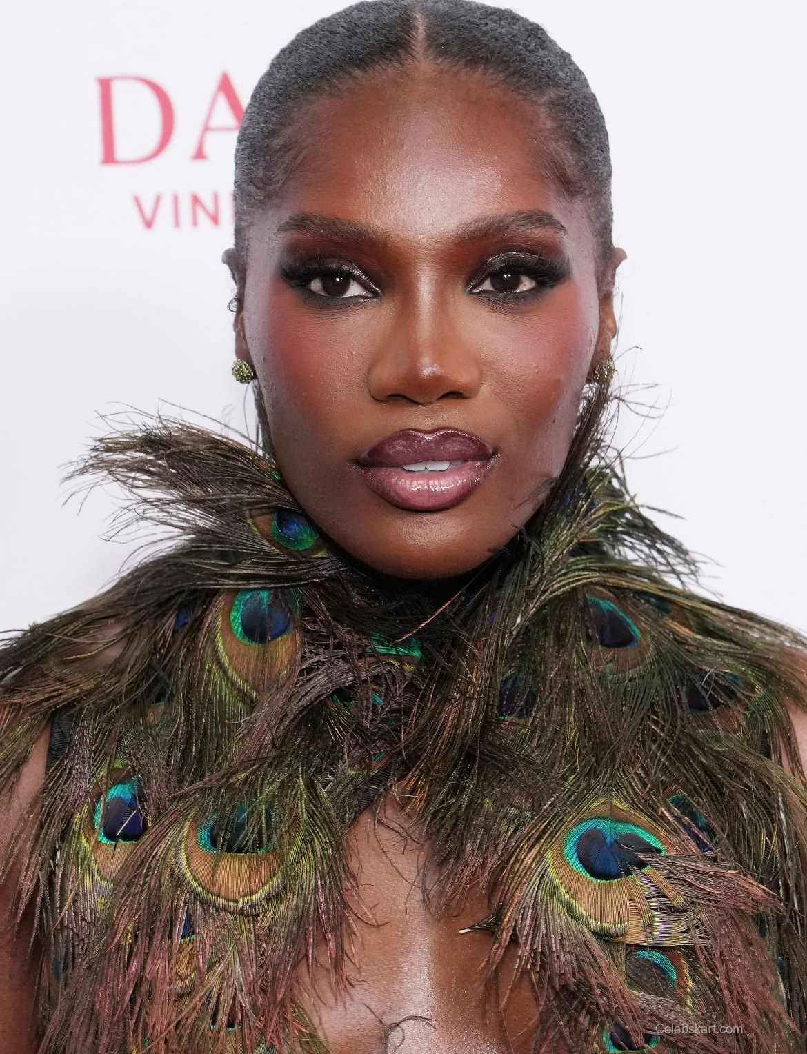 In her poised stance, DOECHII showcased confidence and charisma, drawing attention with her fierce expression. The background, featuring the event's stylish branding, contrasted beautifully with her outfit, enhancing the overall aesthetic of the moment. The lighting highlighted the unique details of her feathered bodice, making it a focal point of her appearance.