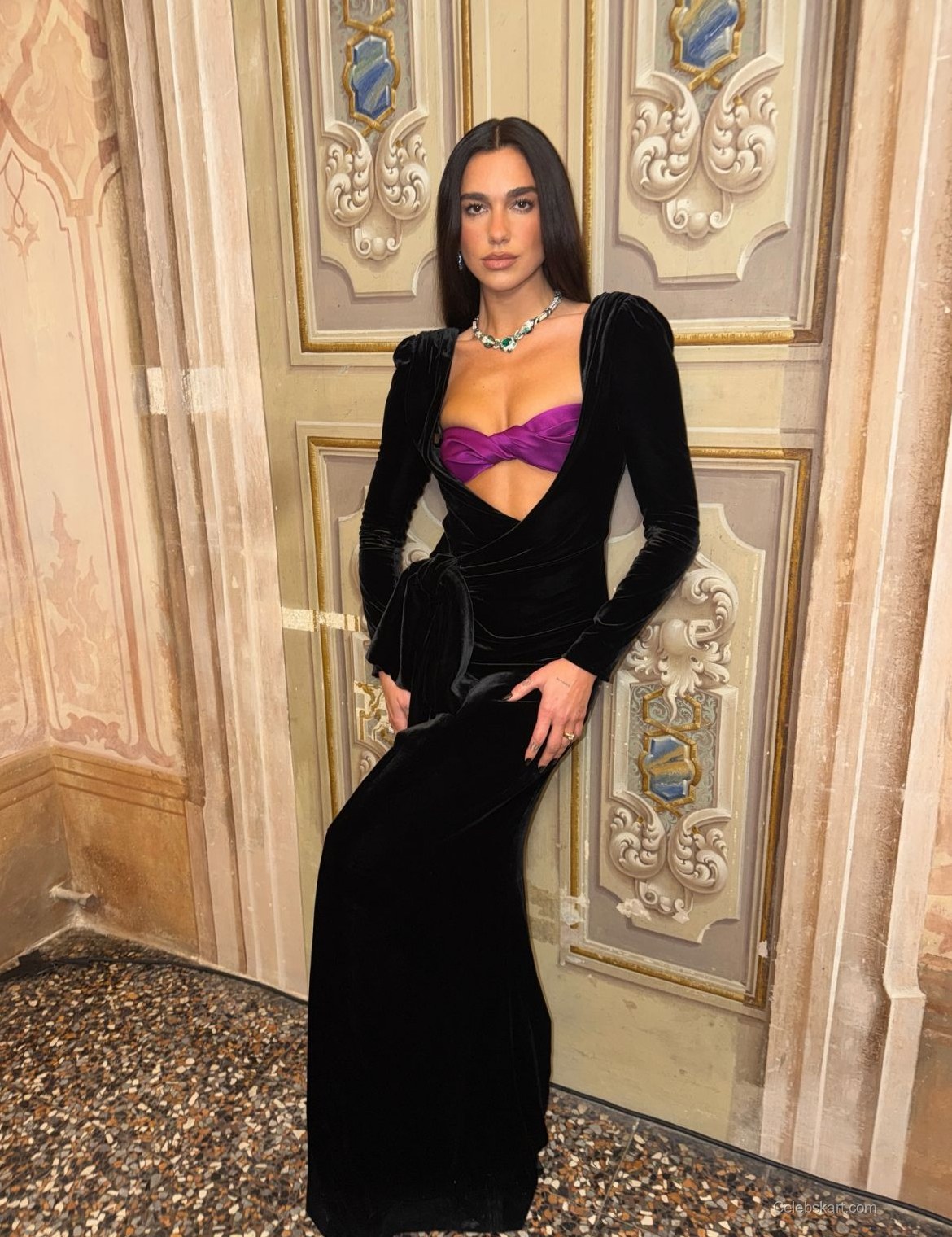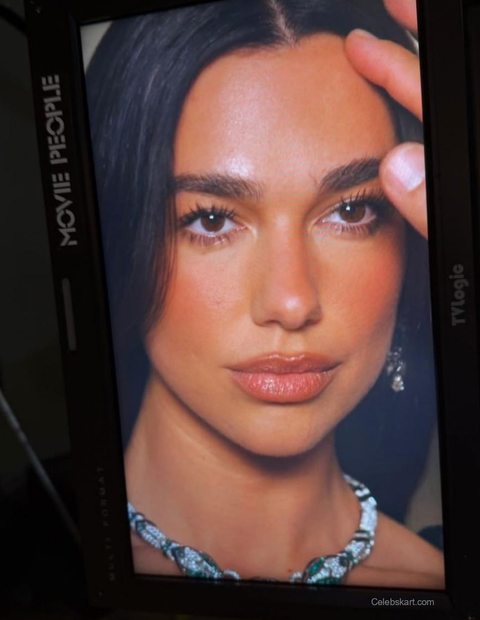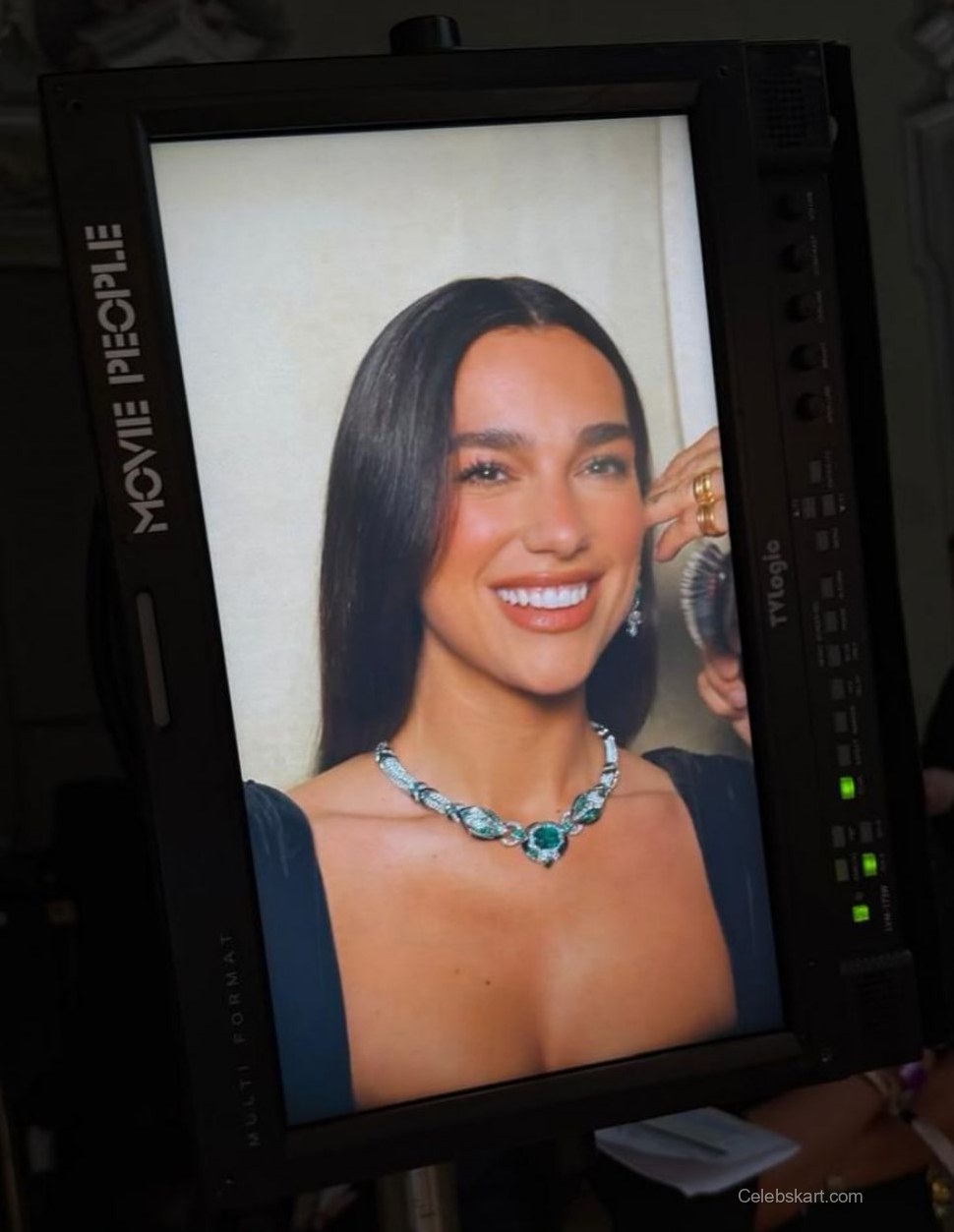 During the shoot, Dua posed gracefully, shifting her weight slightly to one leg, showcasing the gown’s fluidity. Her long hair cascaded down her shoulders, beautifully framing her face. In one captured moment, she adjusted her jewelry, a stunning necklace that complemented her outfit and added a sparkle to her look. The background of the photoshoot, featuring intricate wall details, set an opulent stage, echoing the elegance of her entire appearance.