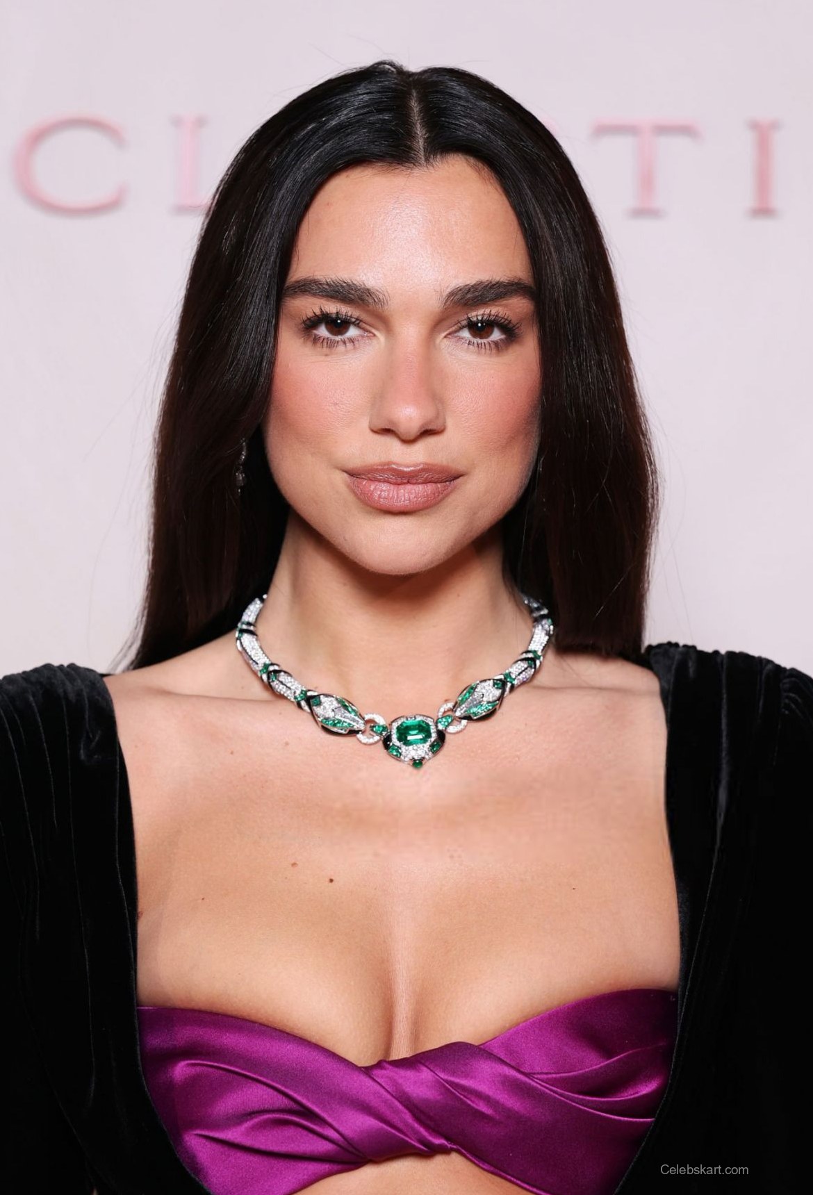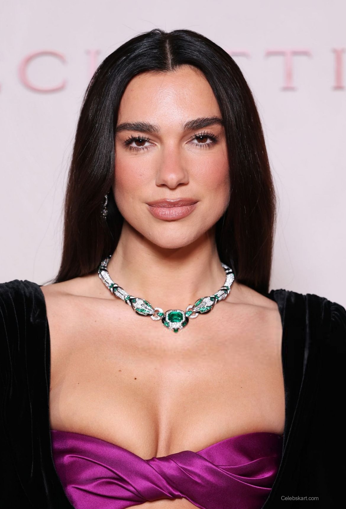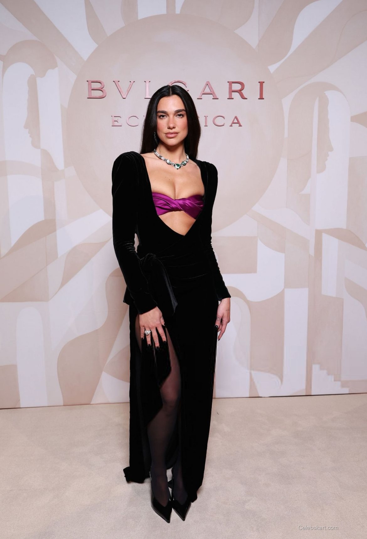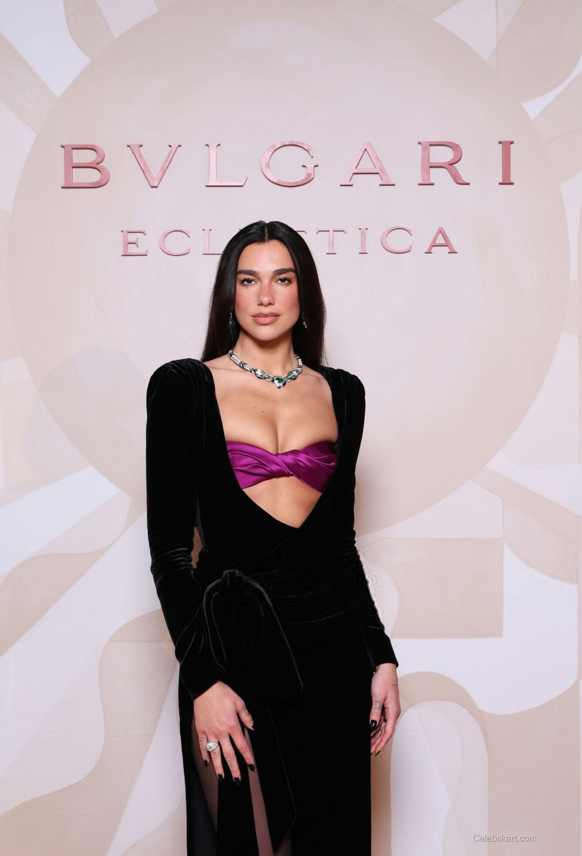 Her outfit featured a dramatic black velvet dress, with long sleeves and a plunging neckline. The dress was paired with a striking purple accent at the bust, creating a captivating contrast that added depth to her look. The fitted silhouette accentuated her figure, while a daring thigh-high slit revealed her stylish black heels. To highlight the outfit's sophistication, Dua accessorized with a beautiful statement necklace adorned with sparkling emeralds and diamonds, perfectly complementing her ensemble.