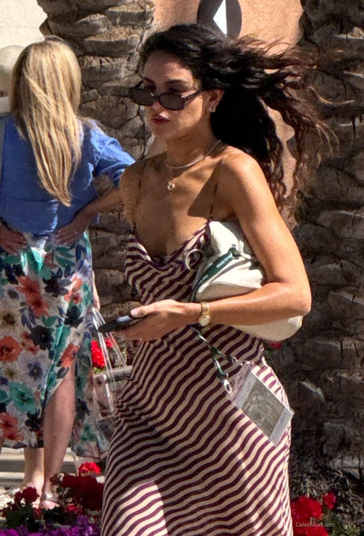 As she navigated through the crowd, Eiza was seen adjusting her sunglasses to shield her eyes from the bright sun. Her long, wavy hair danced in the gentle breeze, enhancing her relaxed demeanor. In one moment, she paused to check her phone, revealing her confidence as she interacted with fans and media present at the event. The backdrop of colorful flowers added a vibrant touch to her appearance, making her stand out amongst the attendees.