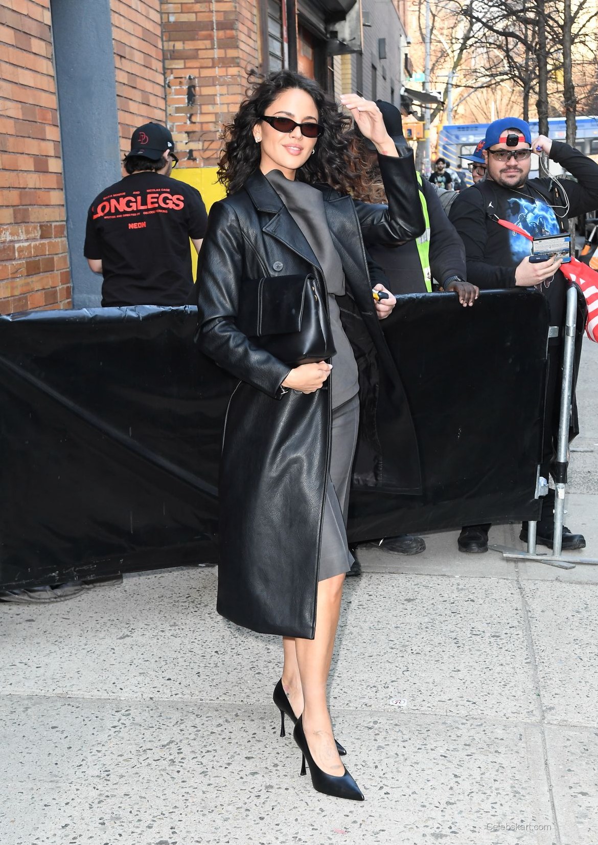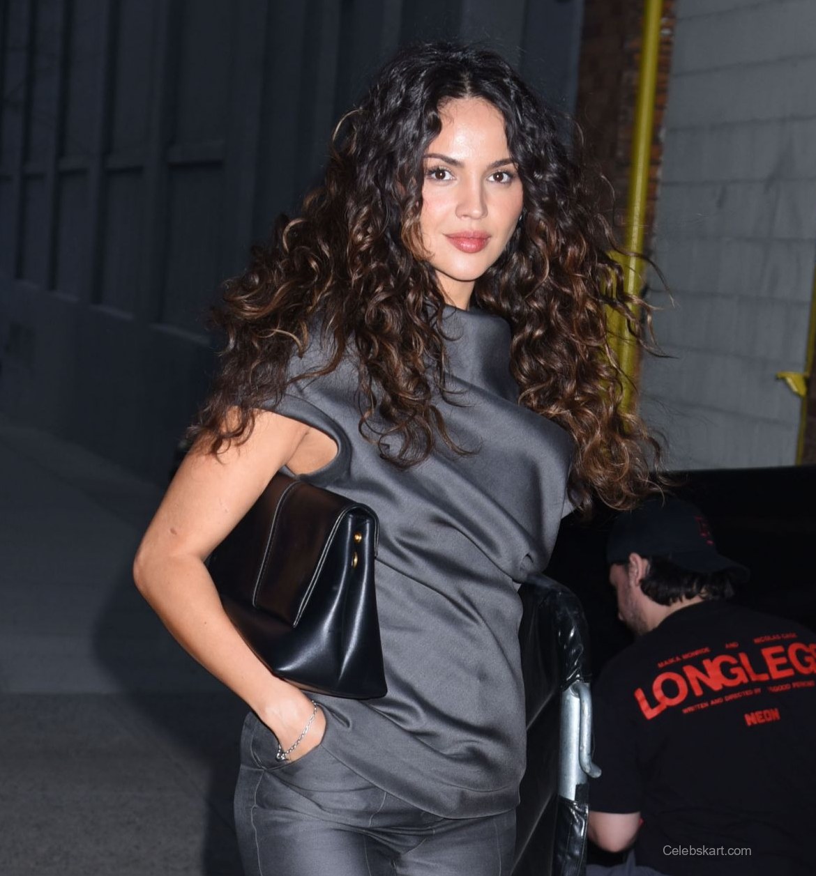 The outfit consisted of a sleek gray top paired with matching cropped trousers, perfectly tailoring to her athletic figure. The ensemble was completed with a stylish long black coat that flowed elegantly behind her. Eiza accessorized her look with pointed black heels that added a sophisticated touch, elevating her overall style.