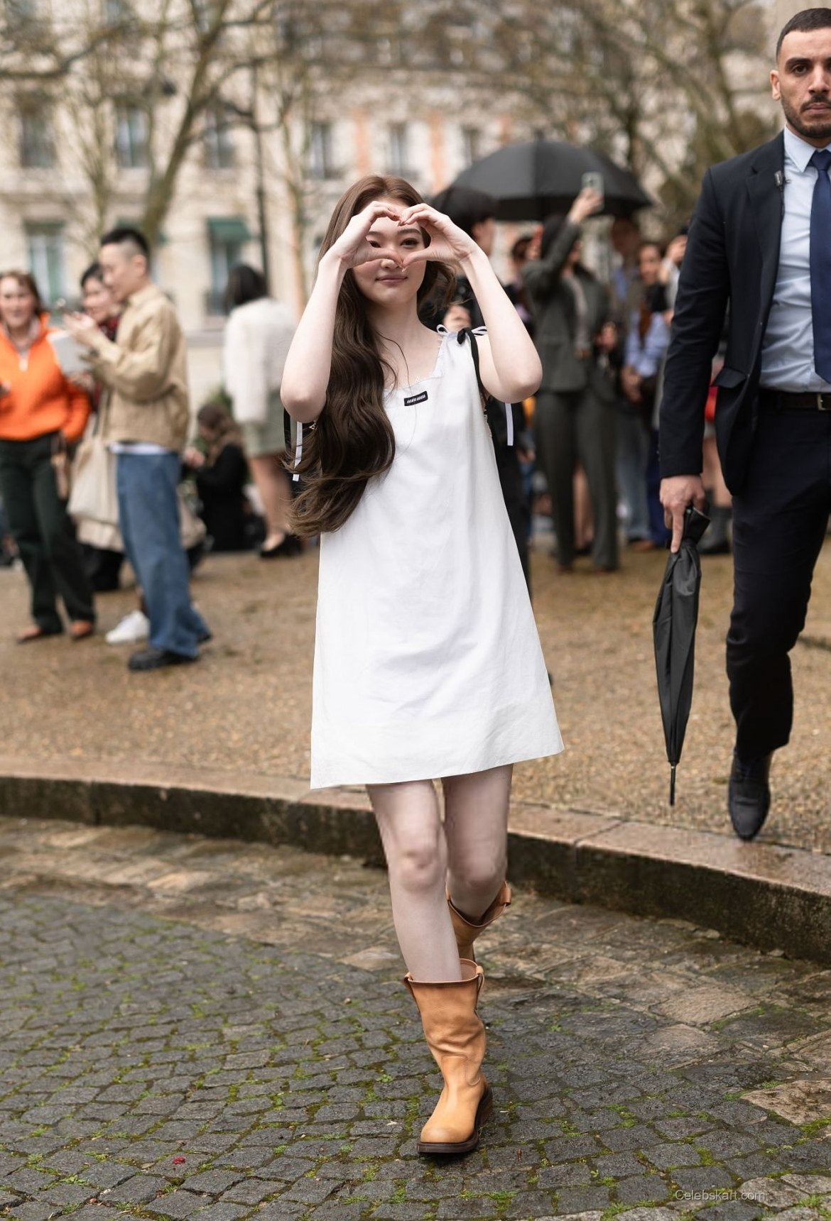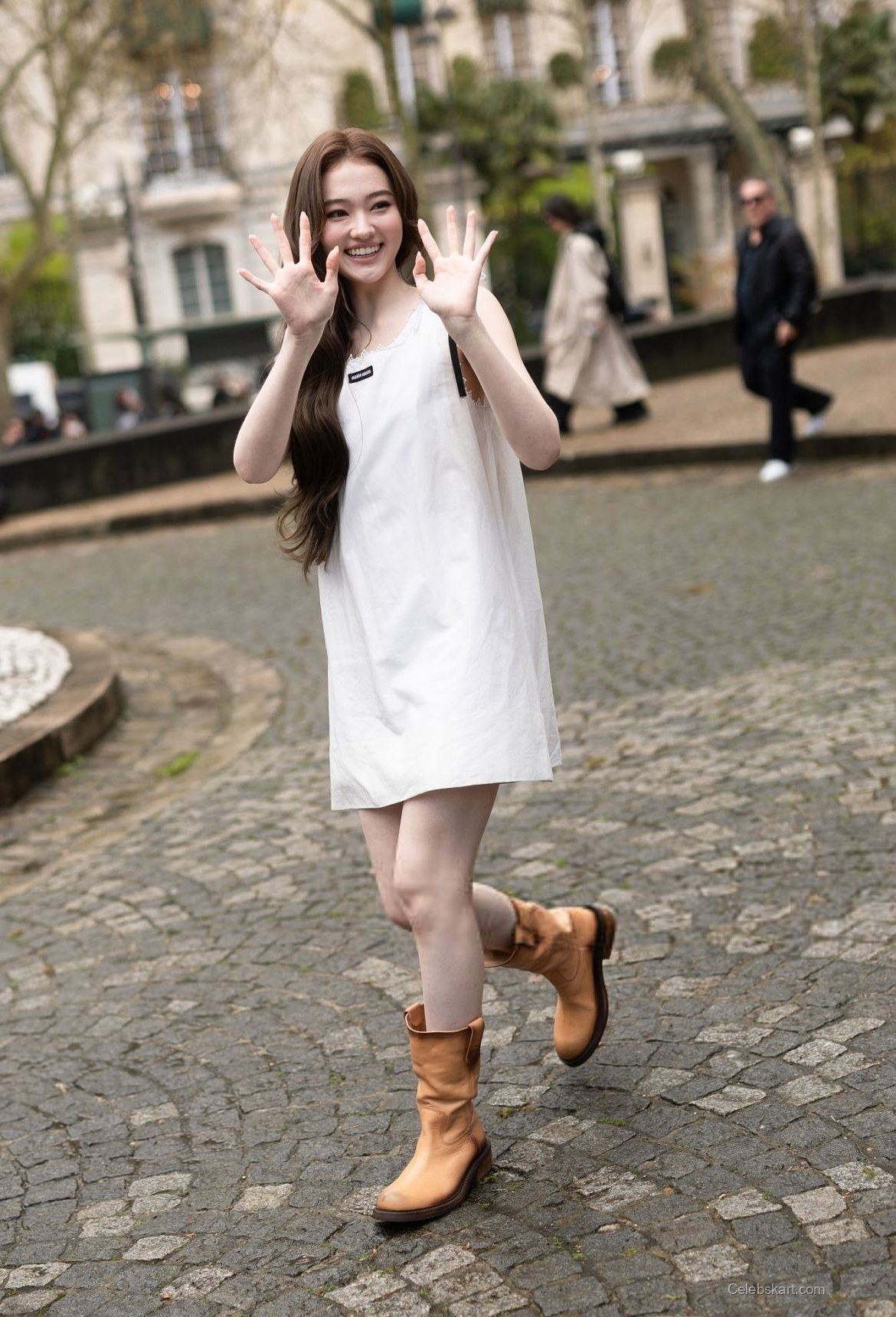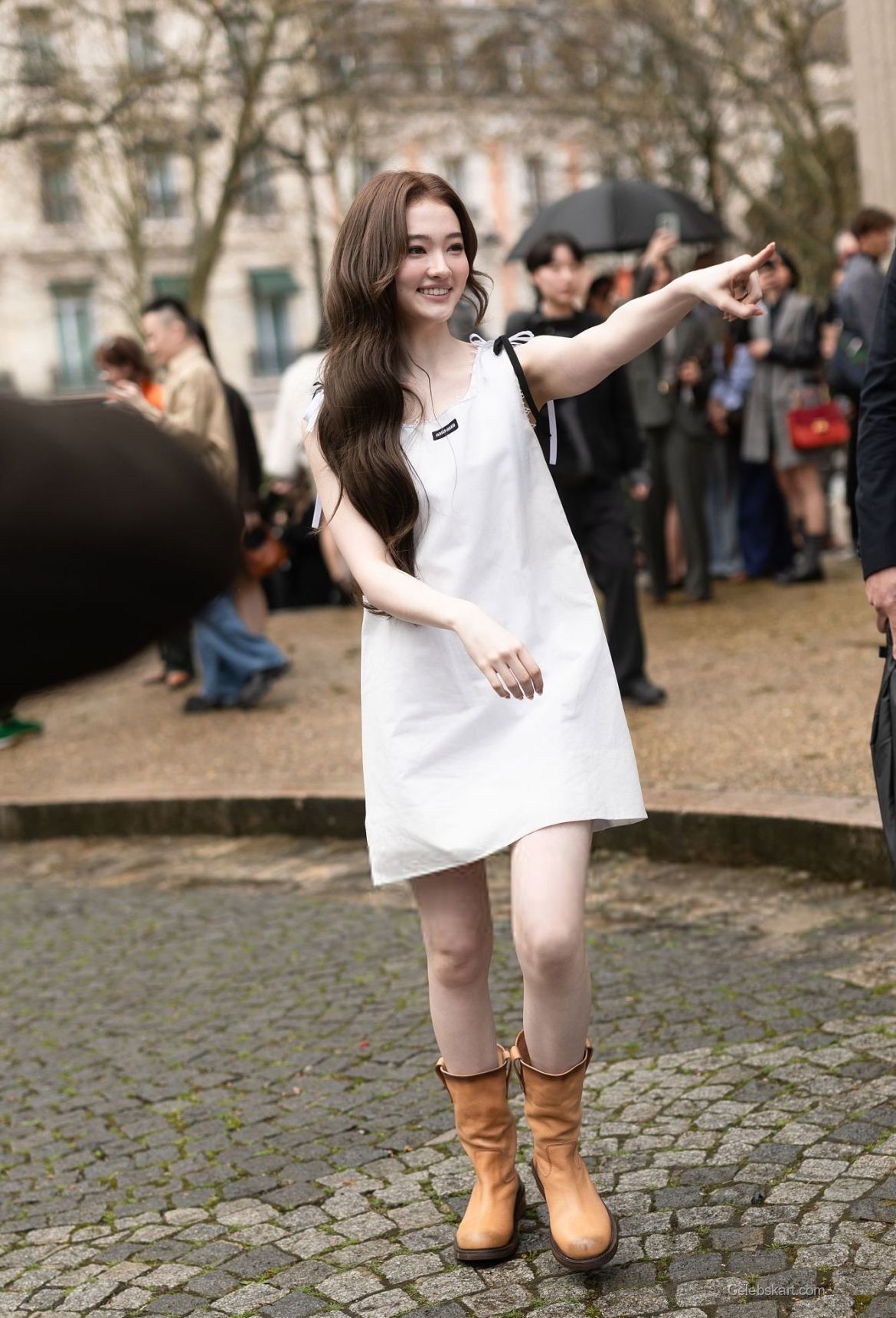 Ella wore a chic white dress that showcased her figure beautifully. The sleeveless design highlighted her arms and offered a contemporary look suitable for the runway. Accompanying the dress, she opted for a pair of tan knee-high boots that provided a bold contrast and brought warmth to her outfit. The subtle details, such as a small black logo on the dress, added just the right touch of edginess to her appearance.