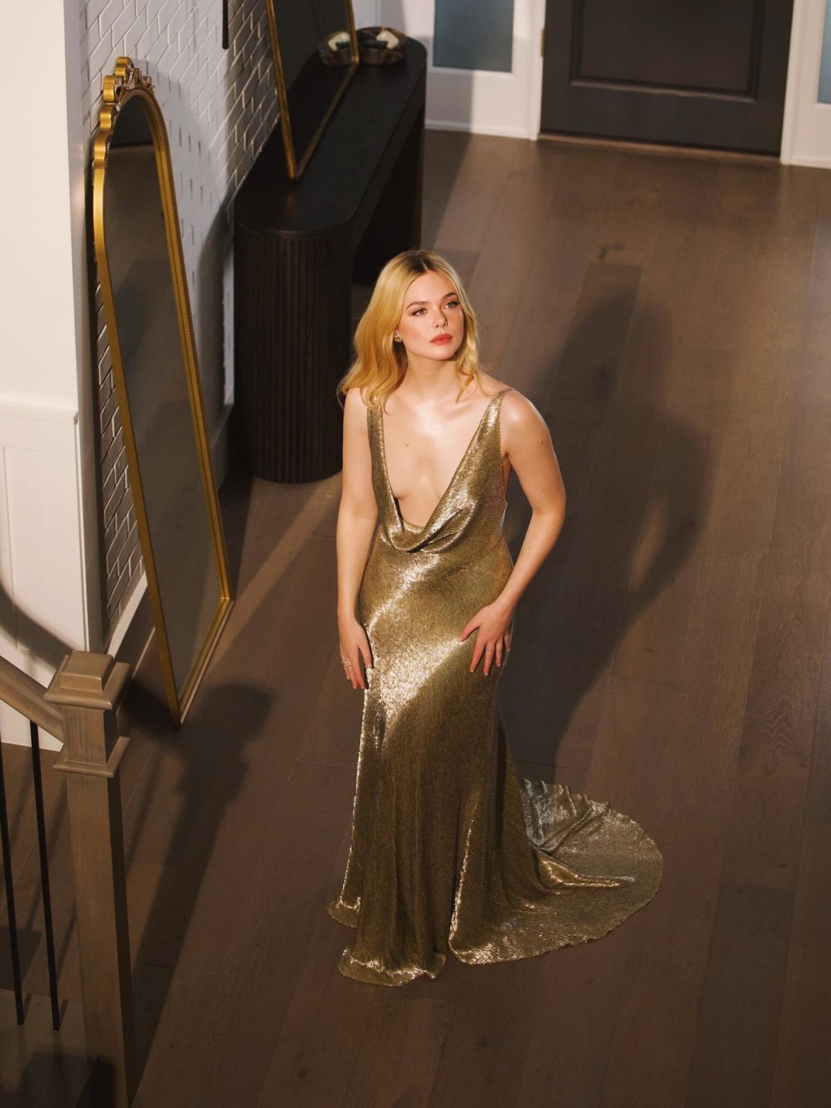 The photos present a refined editorial mood, with Fanning posing across multiple frames as the shoot unfolds in a calm, cinematic atmosphere.