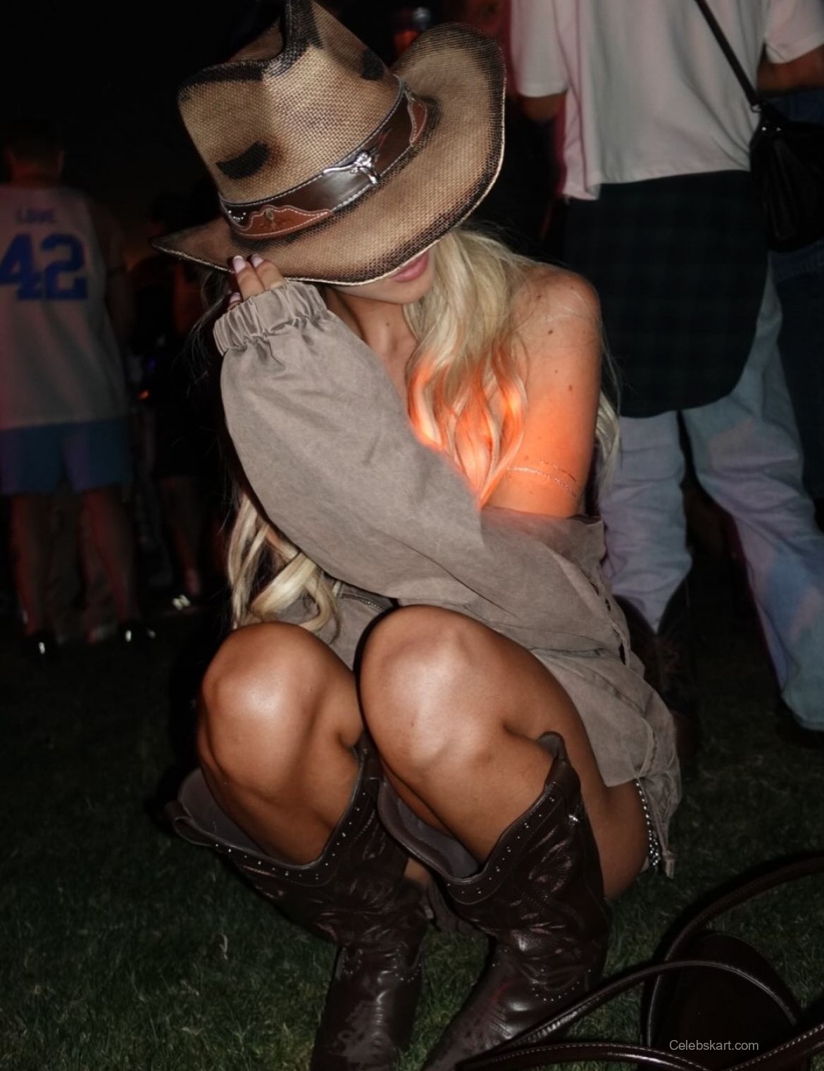 The standout piece of Emily's outfit was her light brown oversized jacket, which added a relaxed yet fashionable vibe. Underneath, she wore a simple brown top that complemented her skin tone beautifully. Her choice of knee-high brown boots provided an edgy contrast, making the entire ensemble cohesive and on-trend. To top off her look, she sported a stylish cowboy hat that not only protected her from the sun but also elevated her overall festival appearance.