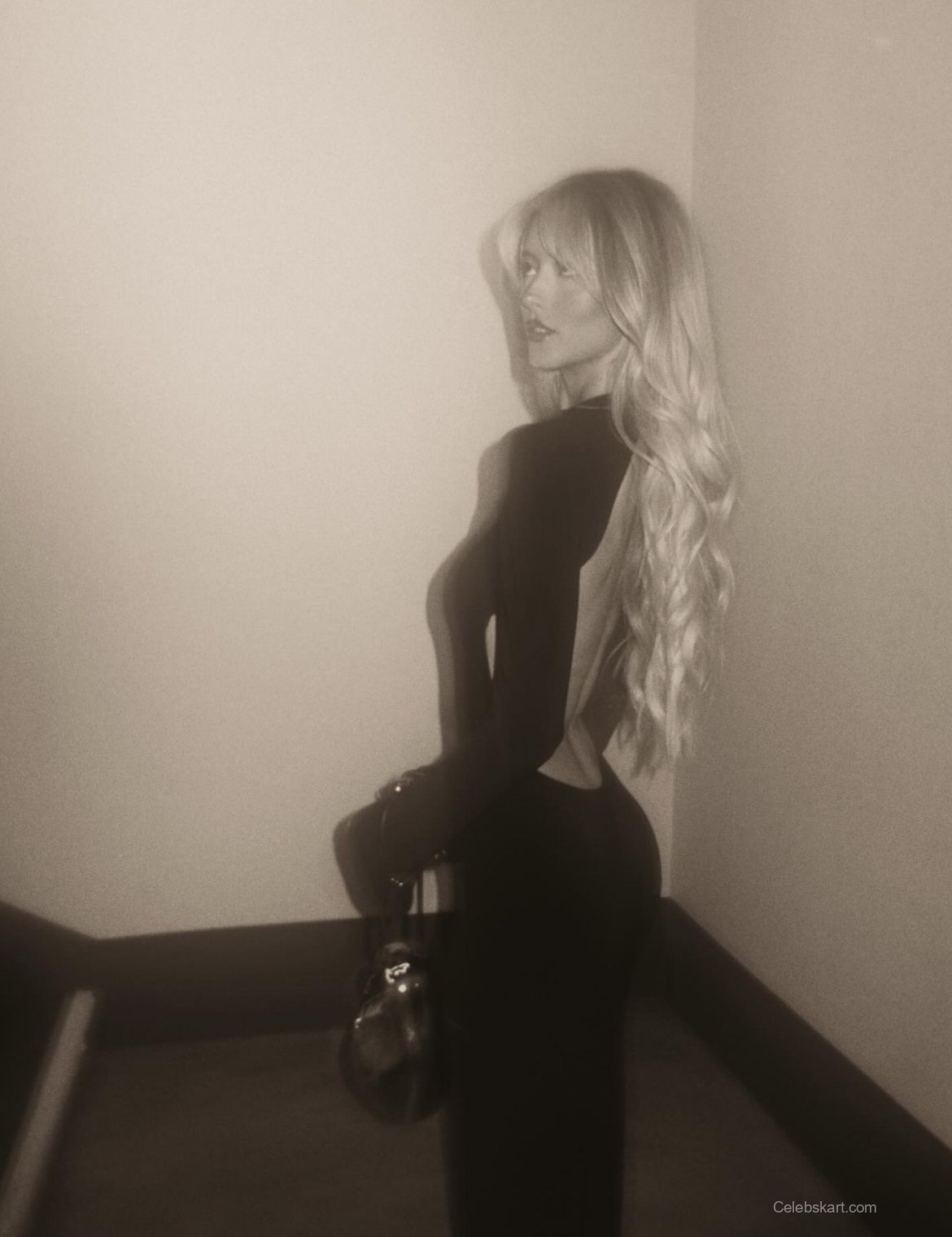 In her latest snapshots, Emily displays a confident demeanor. As she poses, one prominent sight is her hair styled in flowing waves cascading past her shoulders. She holds her hair back with one hand, which beautifully frames her face. The background, with its soft gray tones, allows the outfit and her radiant presence to take center stage. The interplay of lighting highlights the texture of her dress while casting a soft glow on her features.
