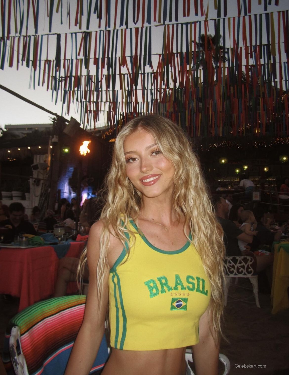 This particular evening, Emily donned a creative and visually striking outfit. The outfit features a soft, blend of earthy tones, enhanced by delicate beading that drapes around her waist and chest. The halter design of the top highlights her figure while maintaining an air of sophistication. The overall look captures an essence of modern elegance.