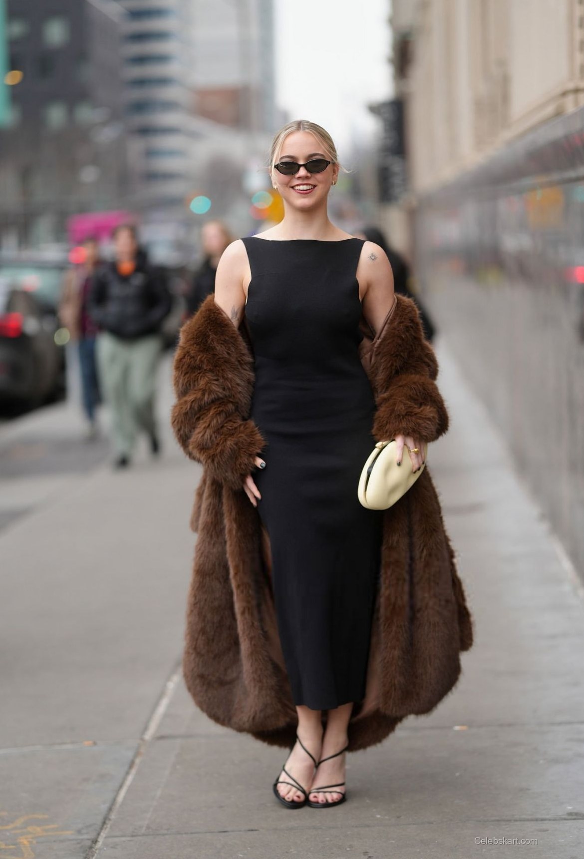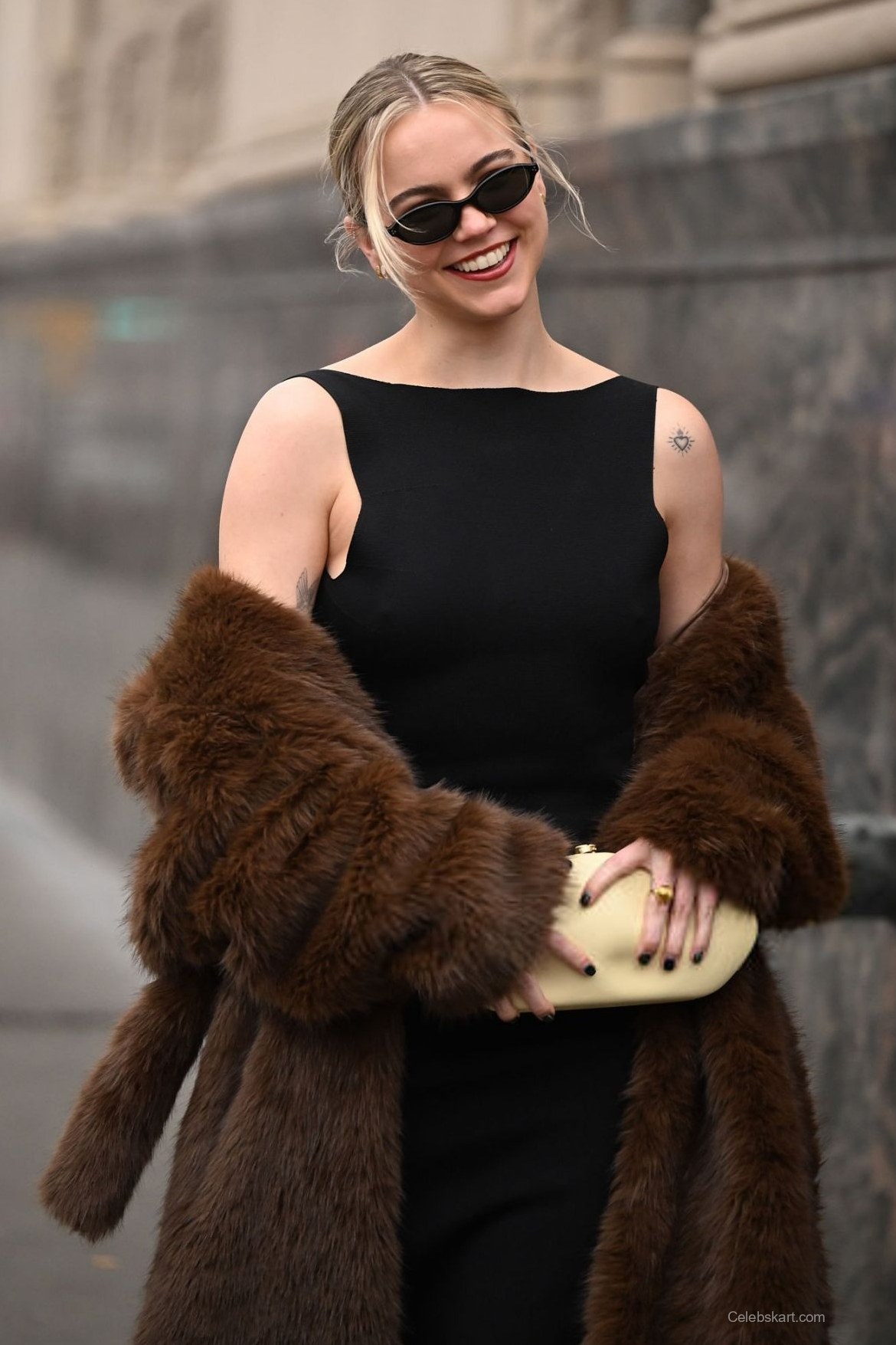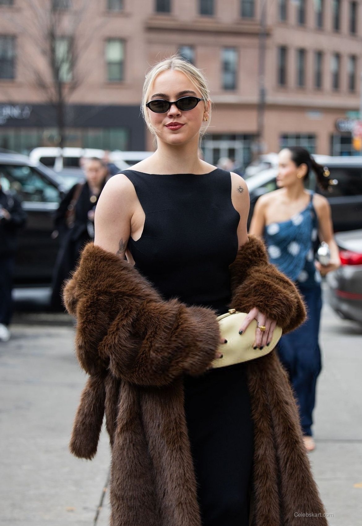 Emma’s outfit is a testament to her fashion-forward sensibilities, blending classic silhouettes with contemporary elements. The sleek black dress is a modern staple that never goes out of style, while the luxurious fur coat introduces a bold textural choice that elevates the entire outfit. By pairing such timeless pieces, she demonstrates an understanding of fashion’s ability to reflect personal style while remaining on-trend.