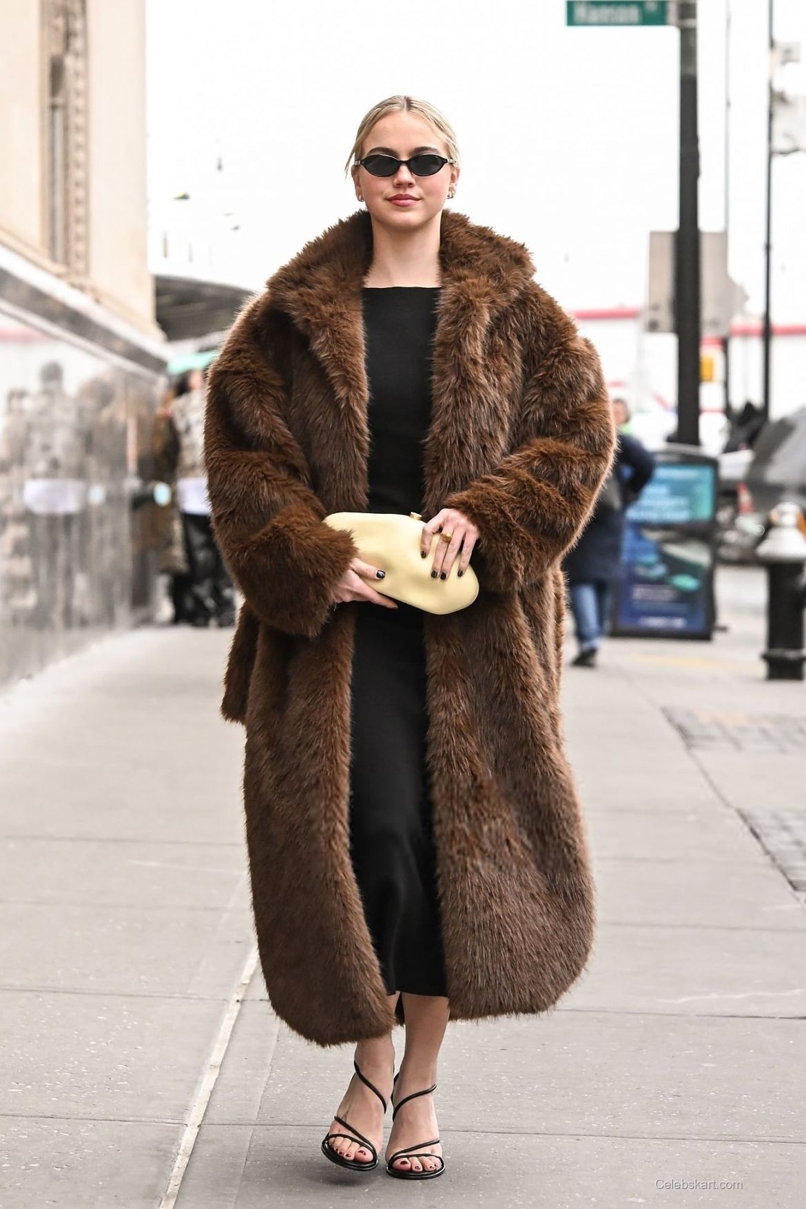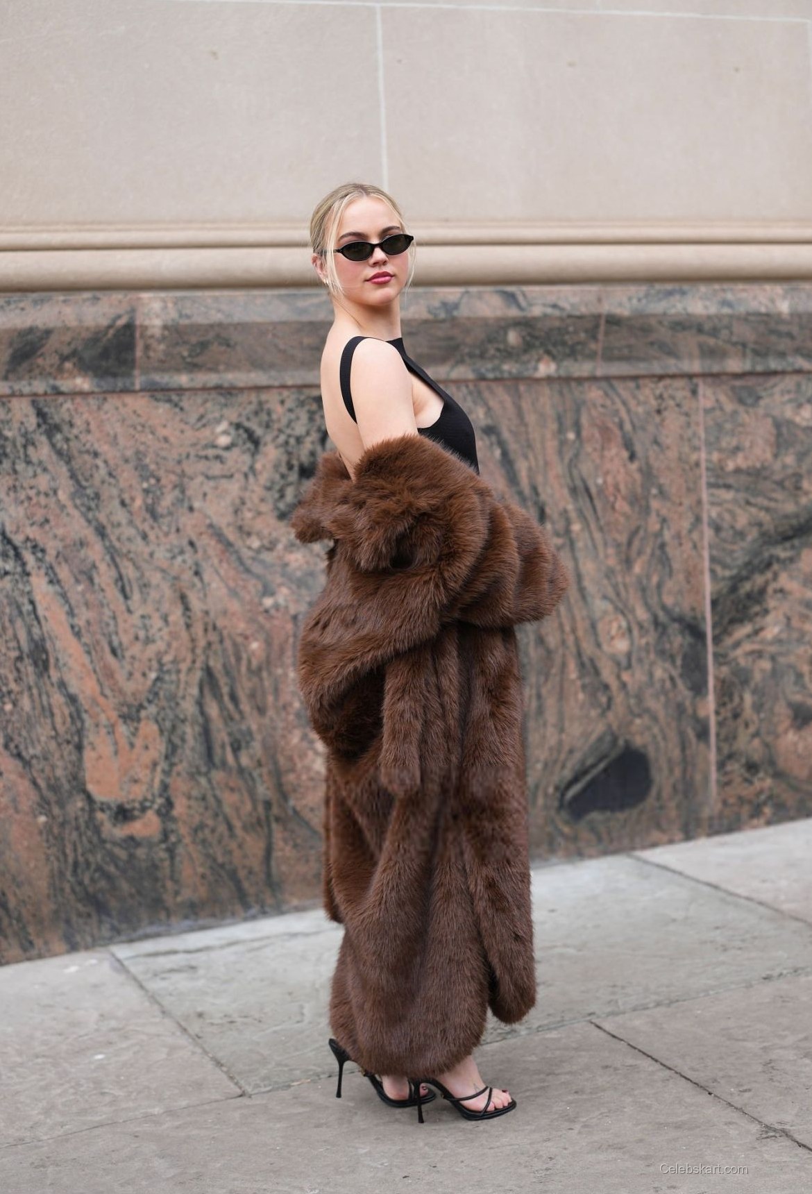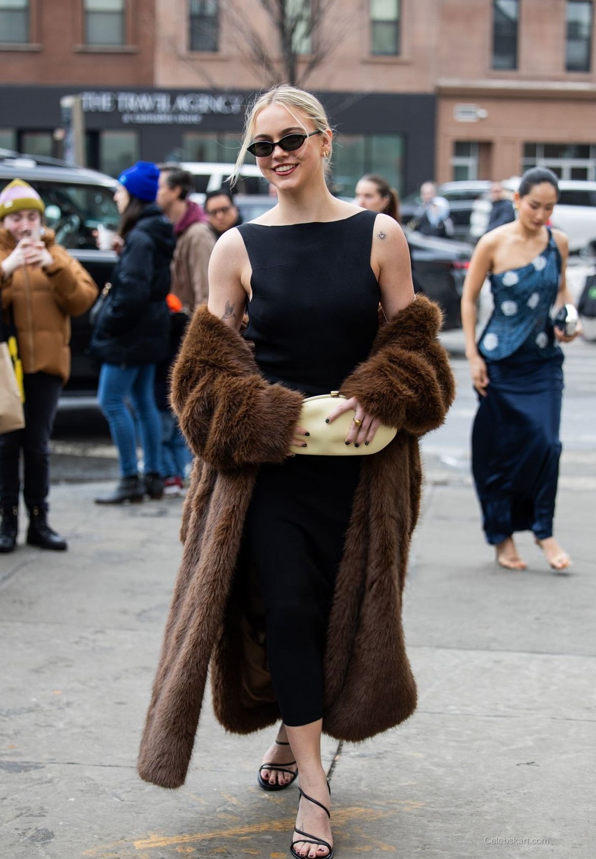 Emma’s outfit is a testament to her fashion-forward sensibilities, blending classic silhouettes with contemporary elements. The sleek black dress is a modern staple that never goes out of style, while the luxurious fur coat introduces a bold textural choice that elevates the entire outfit. By pairing such timeless pieces, she demonstrates an understanding of fashion’s ability to reflect personal style while remaining on-trend.