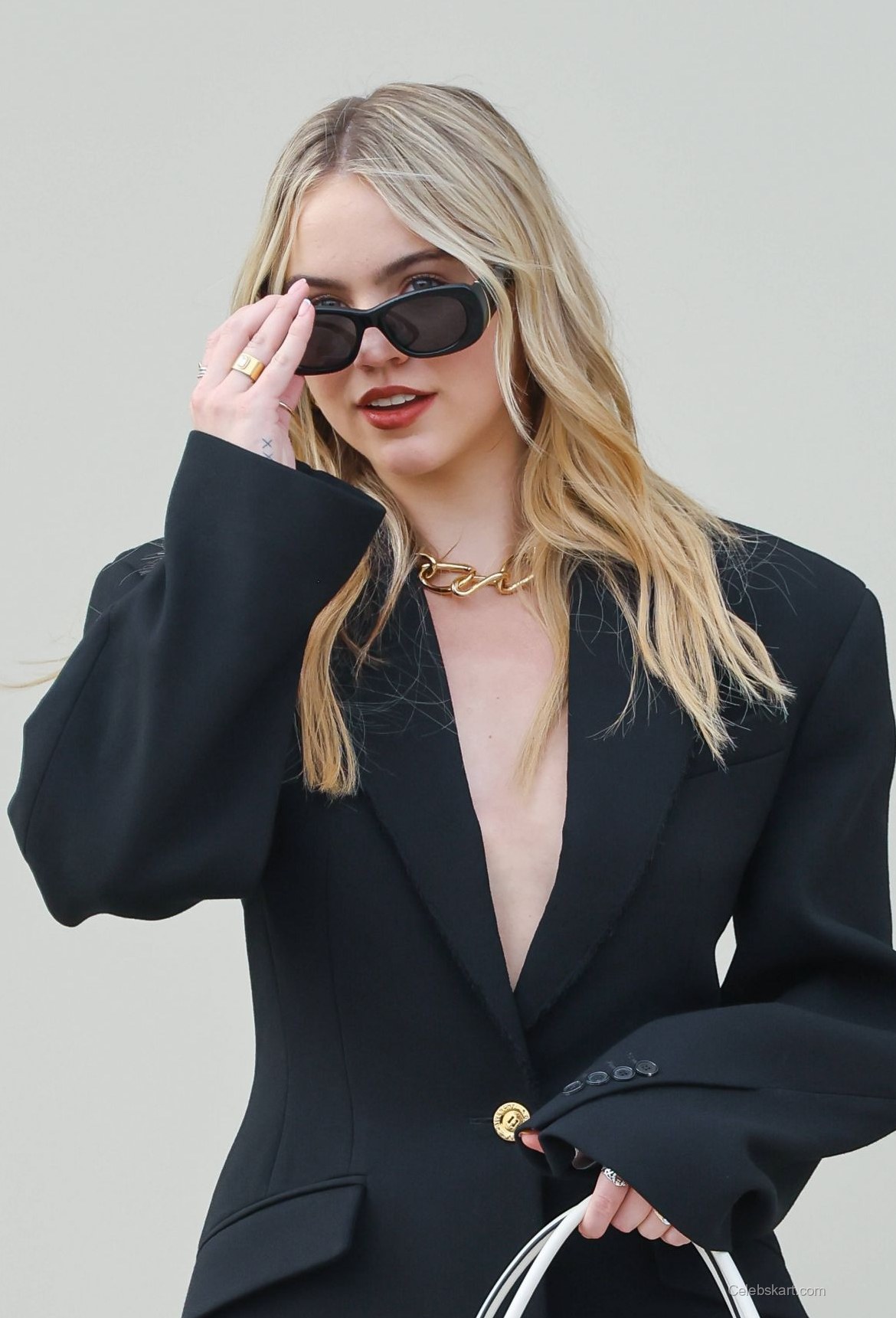 The primary outfit featured Emma in a tailored black blazer that accentuated her figure and offered a flattering silhouette. The blazer had a unique cut, presenting a daring neckline that highlighted her style and confidence. A high slit in her matching skirt added a touch of drama, making the ensemble both elegant and modern. Complementing her look was a white handbag, which provided a striking contrast to the darker tones of her outfit. Emma paired her stylish attire with black sunglasses, emphasizing her trendy approach to accessorizing. For more photos of Emma Brooks, check out these Emma Brooks' looks.