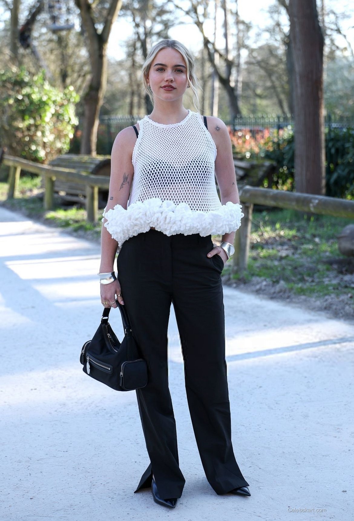 Emma wore a striking white mesh top with a floral hemline, capturing attention instantly. The transparent texture of the top added a fresh, airy vibe, while black high-waisted trousers balanced the look with sophistication. Paired with pointed-toe heels, her ensemble was a perfect statement of modern fashion. The contrast of the outfit’s light color against the darker trousers provided a stylish balance.
