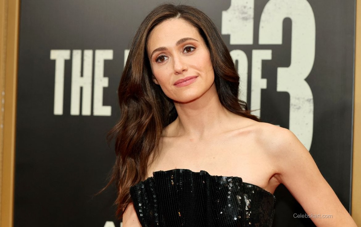 For the event, Emmy Rossum wore a striking black strapless dress that elegantly hugged her figure. The dress featured a unique textured bodice with a ruffled design, adding a modern twist to a classic silhouette. The form-fitting lower half of the dress complemented her shape beautifully, emphasizing her graceful posture. She paired the outfit with minimal accessories, allowing the dress to take center stage.