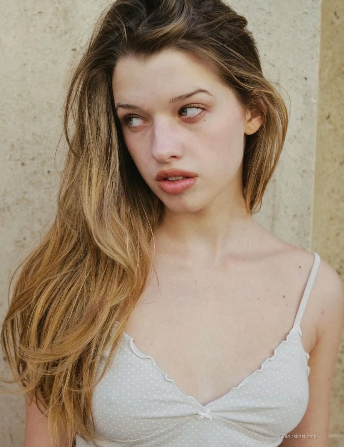 The outfit chosen for this photoshoot features a delicate beige top adorned with cute white polka dots. The soft fabric drapes elegantly across her shoulders and neckline, creating a fresh and breezy vibe. As she moves, the outfit accentuates her youthful energy and highlights her natural beauty. This particular look radiates a casual sophistication that is both approachable and stylish. For more examples of Ever's fashion style, check out similar looks from her recent appearances.