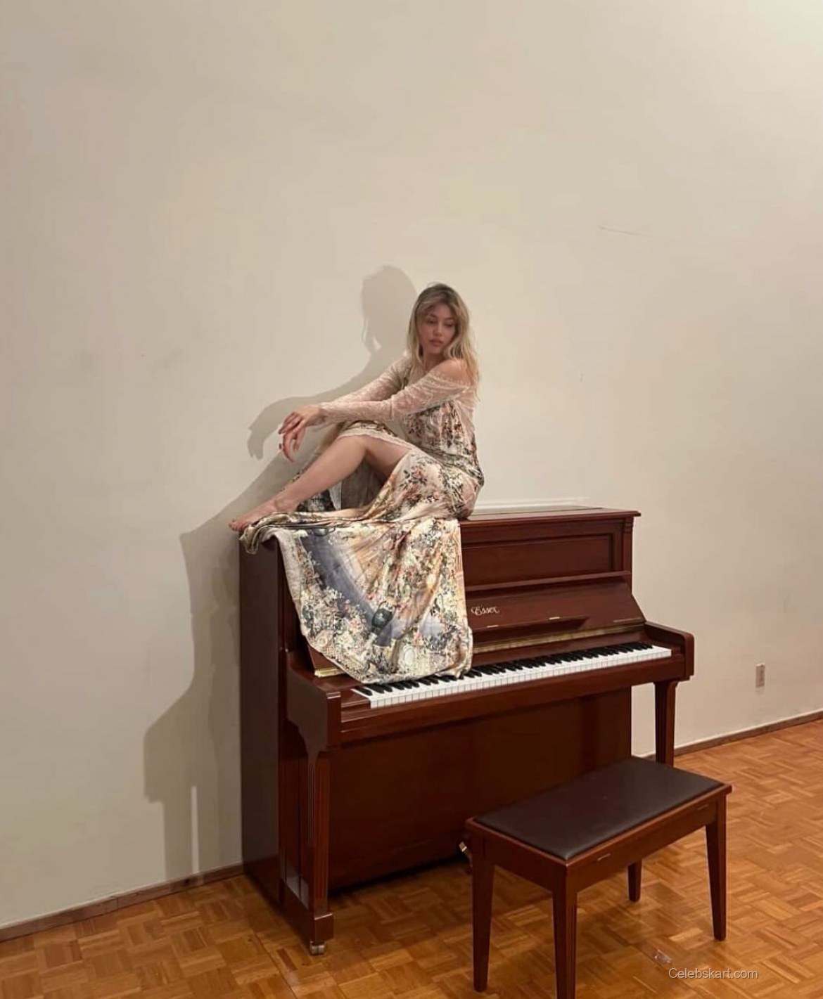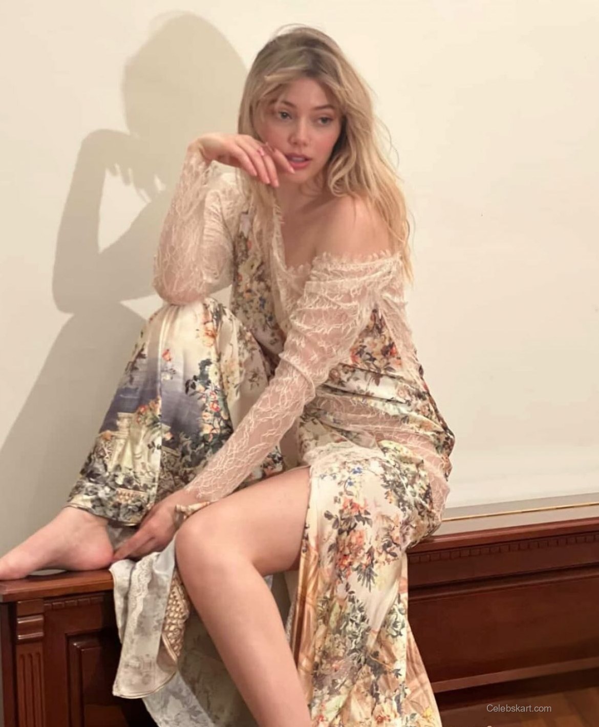 One of the standout outfits featured in the shoot is a vibrant pink ensemble adorned with soft, feathery embellishments. The bright pink contrasts beautifully against her fair skin, adding a touch of daring vibrancy. The outfit’s exquisite fabric drapes elegantly, ensuring that every movement is fluid and graceful. Another look captures her in a flowing, floral-patterned dress, with soft, pastel colors that evoke a sense of timeless charm. The long sleeves and comfortable fit accentuate her figure while providing an ethereal quality. In the backdrop, warm lighting enhances the cozy, intimate vibe of the setting, allowing her outfits to glow.
