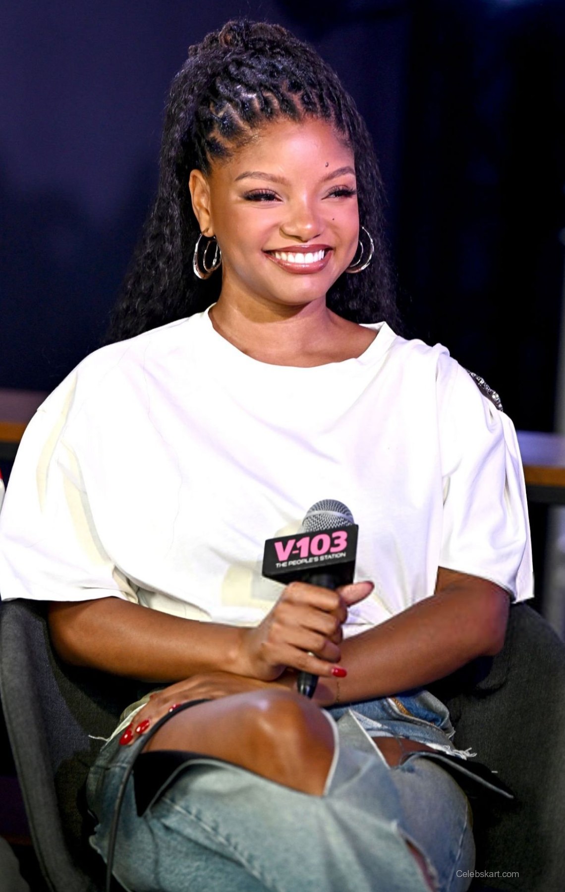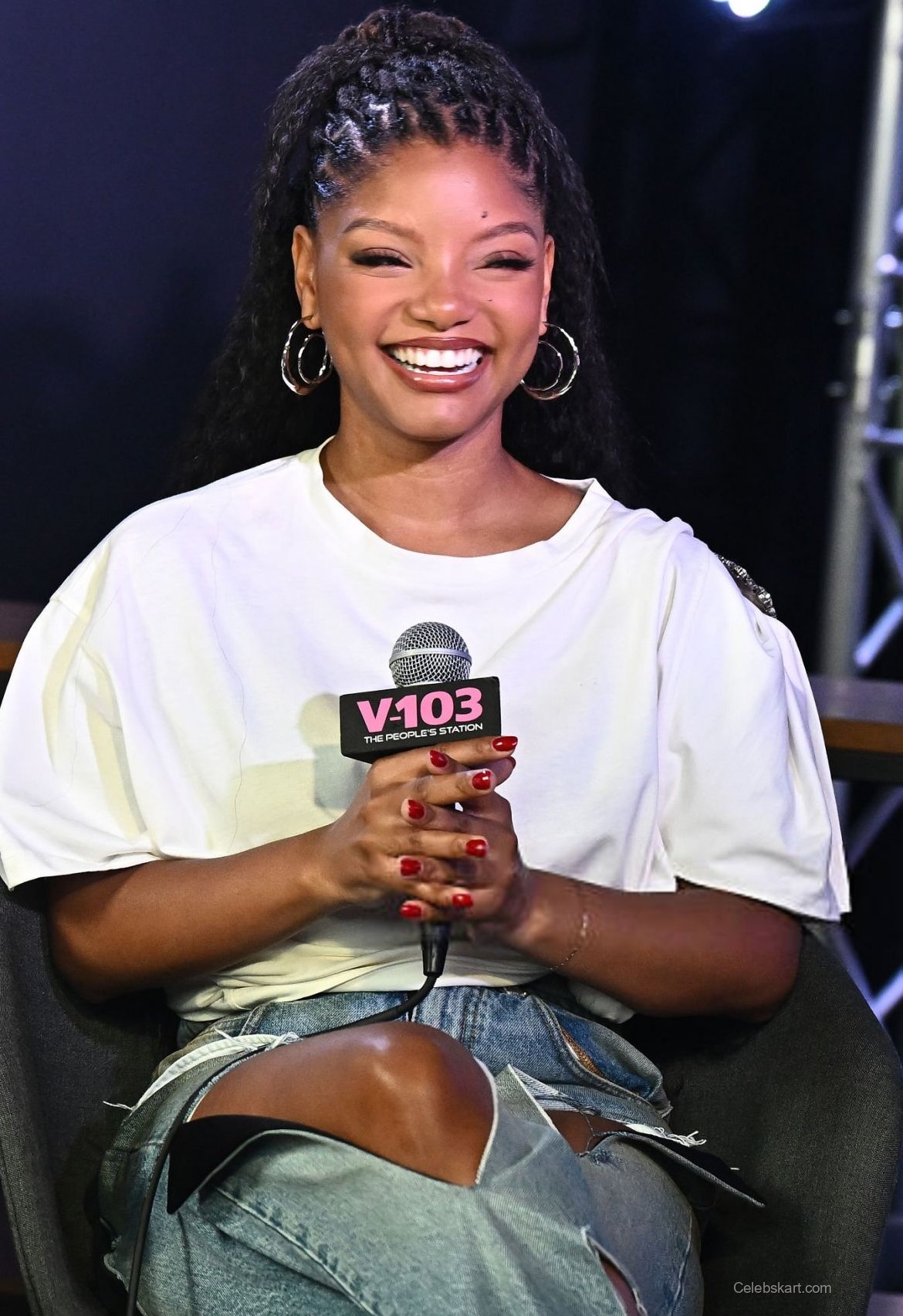 With her hair styled in cascading waves and a subtle makeup look, Halle’s glow brightened the event. She was seen laughing and engaging warmly with Jazzy McBee, highlighting her cheerful demeanor. In one moment, she leaned forward, animatedly sharing a story, which made her appear approachable and friendly. The ambiance at V-103’s Big Tigger Show was electric, filled with laughter and creative energy. For fans who want to see more moments like this, check out our gallery featuring Halle Bailey's best looks.