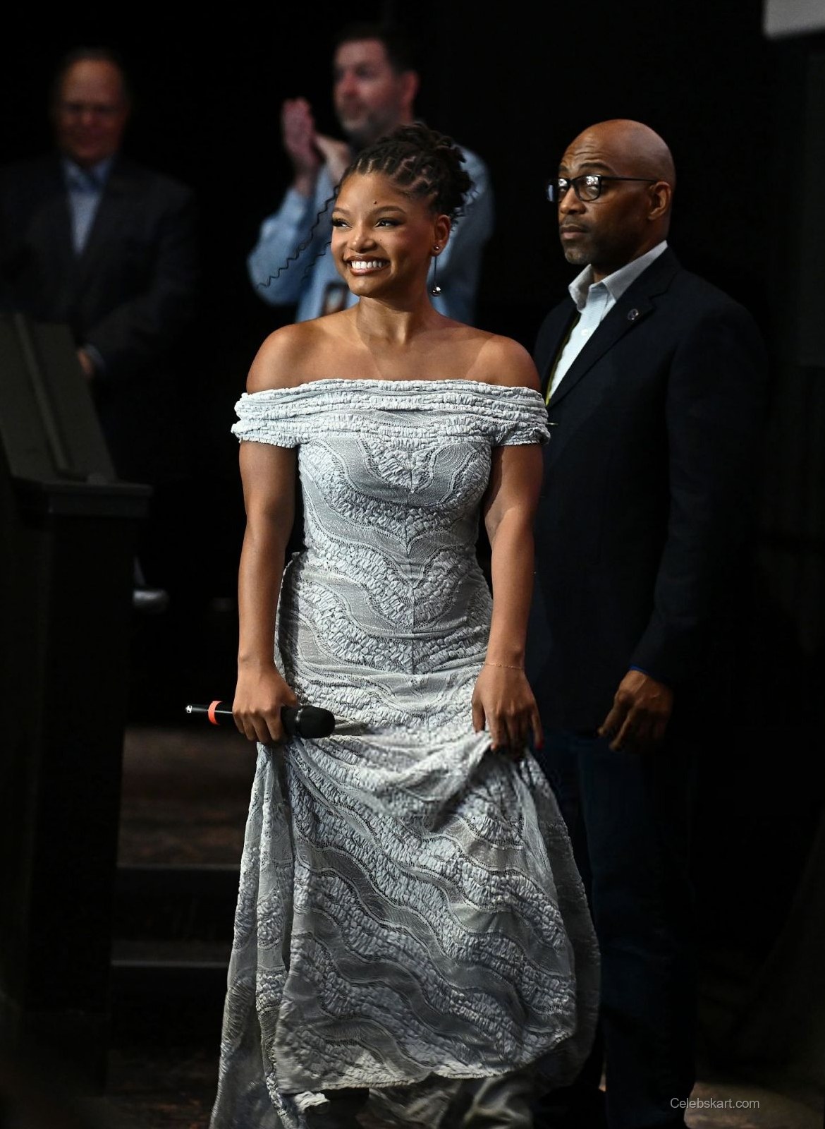 The dress featured intricate detailing with a textured white material that flowed gracefully as she moved. The elegance of the piece was enhanced by its off-shoulder design, showcasing her neckline and shoulders beautifully. Paired with delicate earrings and subtle makeup, Halle's look was nothing short of captivating. The dress' fabric shimmered subtly under the lights, contributing to her radiant presence.