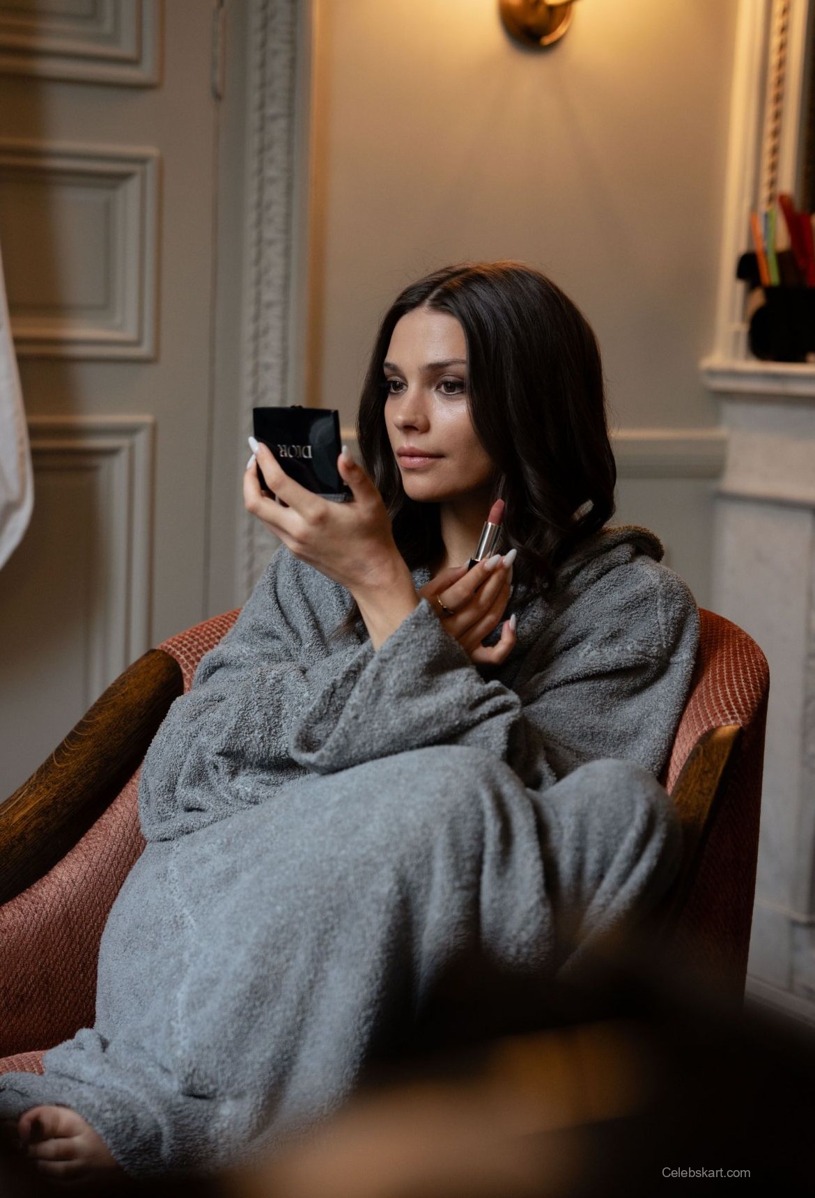 Harriet posed gracefully in a well-lit setting, surrounded by a classic, elegant backdrop. The soft glow from the ambient lighting accentuated her features, giving her an ethereal appearance. As she applied her makeup, her focused expression conveyed a sense of calm and poise. The cozy nature of her outfit perfectly contrasted with the high-fashion environment, showcasing her ability to blend comfort with style. Her long, loose waves framed her face beautifully, adding to her effortless charm.