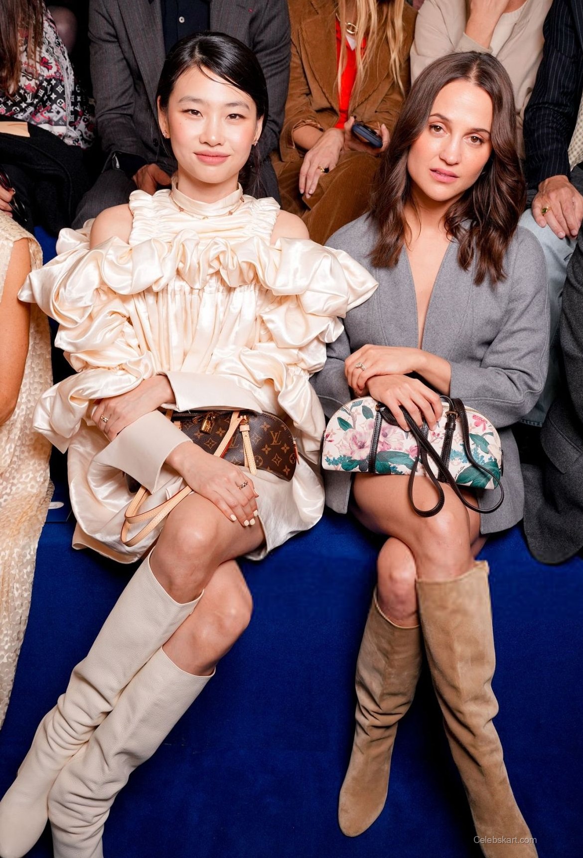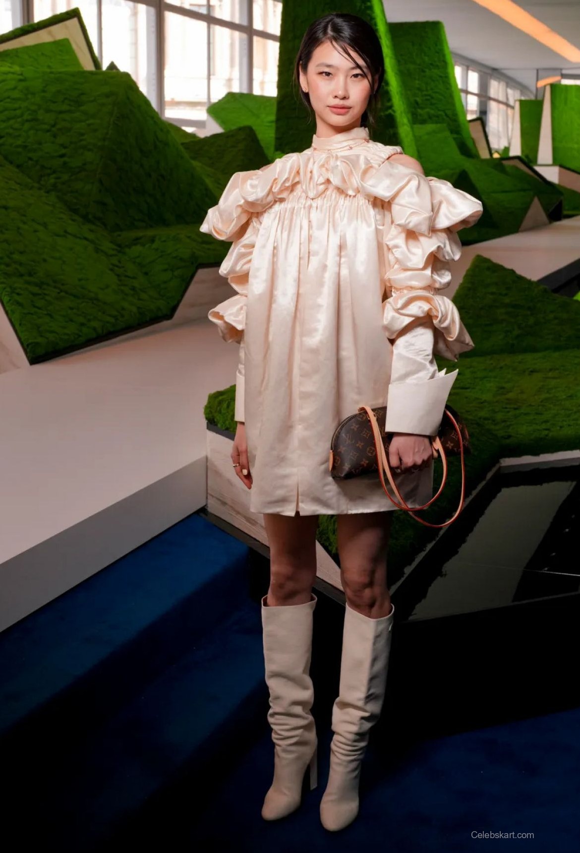 Hoyeon donned a visually intriguing outfit that featured a soft, shimmering fabric. The dress showcased voluminous sleeves that added an element of drama, perfectly complementing her sophisticated silhouette. Paired with knee-high, cream-colored boots, her outfit stood out against the vibrant backdrop of the show. She accessorized with a chic Louis Vuitton bag, adding a touch of luxury to her ensemble. For more insights into Hoyeon's fashion journey, check out these unique styles she has worn before.