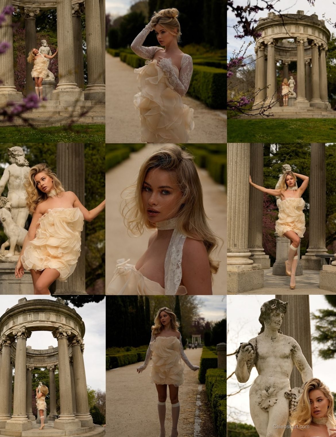 In one captivating moment, she posed near a classic statue, allowing the background's greenery to complement her look. Gorgeous soft waves cascaded down her shoulders, enhancing her overall appeal. As she adjusted her scarf, sunlight danced on her hair, creating a striking contrast against her outfit. Located within the picturesque garden, Ilona’s presence was both radiant and inviting, drawing attention from onlookers.
