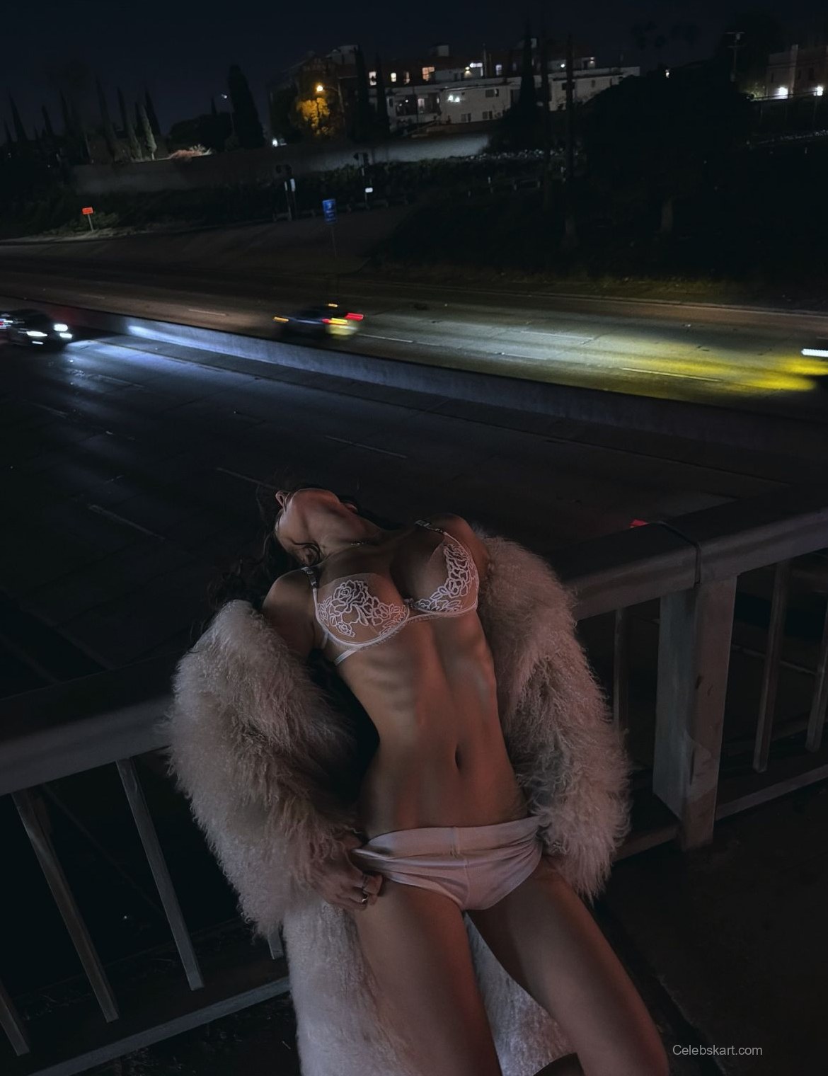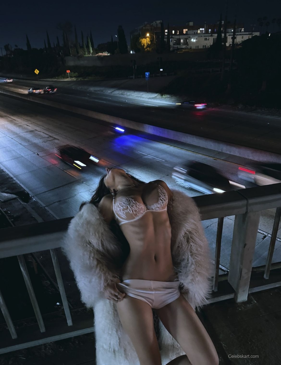 The backdrop features a bustling Los Angeles freeway, which brings life into the photos. The nighttime setting casts a cinematic quality, reminiscent of classic Hollywood glamor. As Ines Trocchia takes center stage, her ensemble becomes a conversation starter among her followers who appreciate her bold stylistic choices and ability to blend contemporary looks with a hint of vintage charm. For more amazing images, see more Ines Trocchia or some event highlights where she’s showcased similar styles.