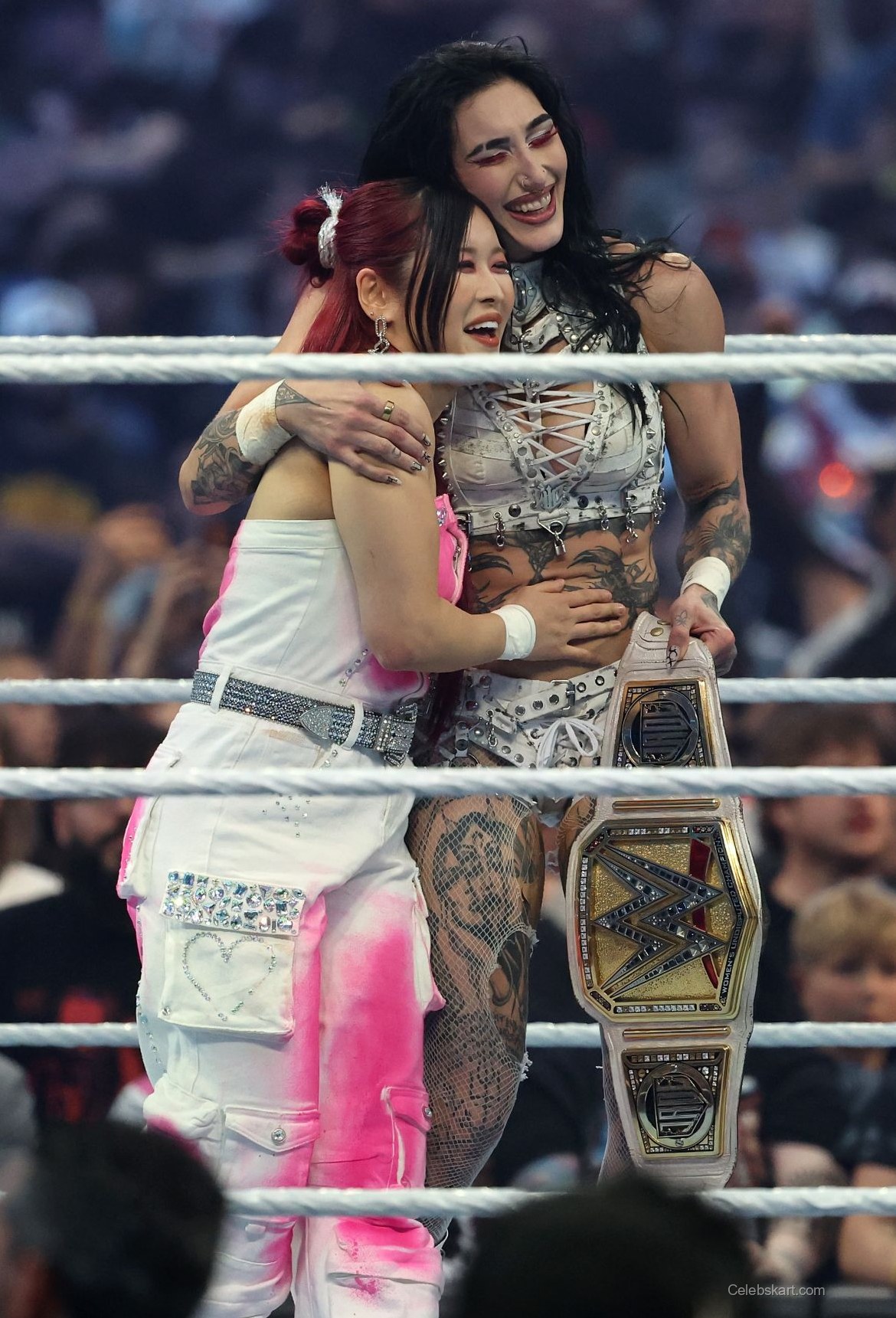 IYO SKY's pose in the ring exuded confidence as she celebrated a victorious moment. Her hair, styled in loose waves, flowed gracefully, enhancing her fierce look. The background buzzed with the excitement of the crowd, intensifying the moment as she embraced her fellow wrestler. The energy in the arena was palpable, and her smile radiated joy and triumph. Her body language conveyed both strength and approachability, making her relatable to fans.