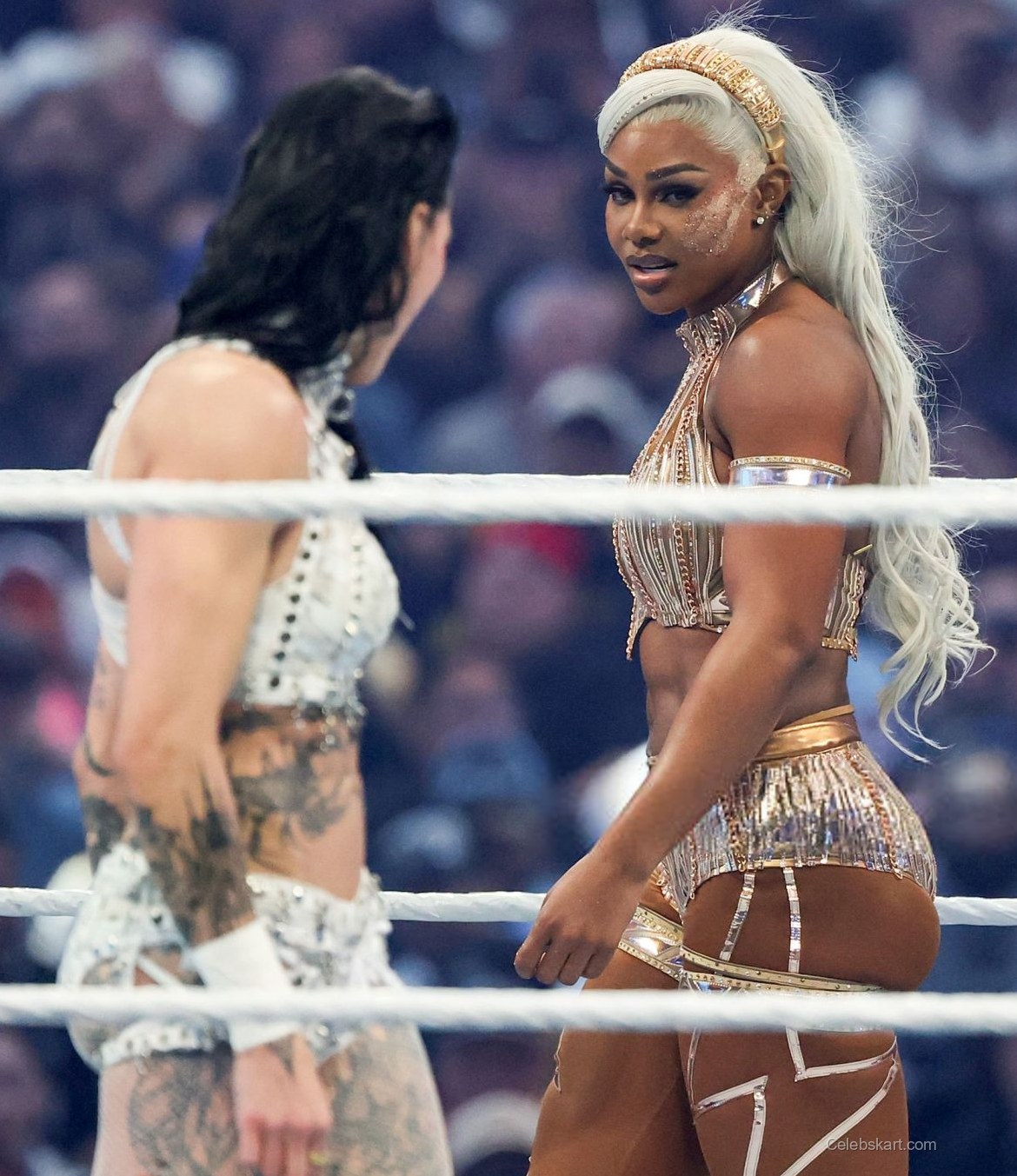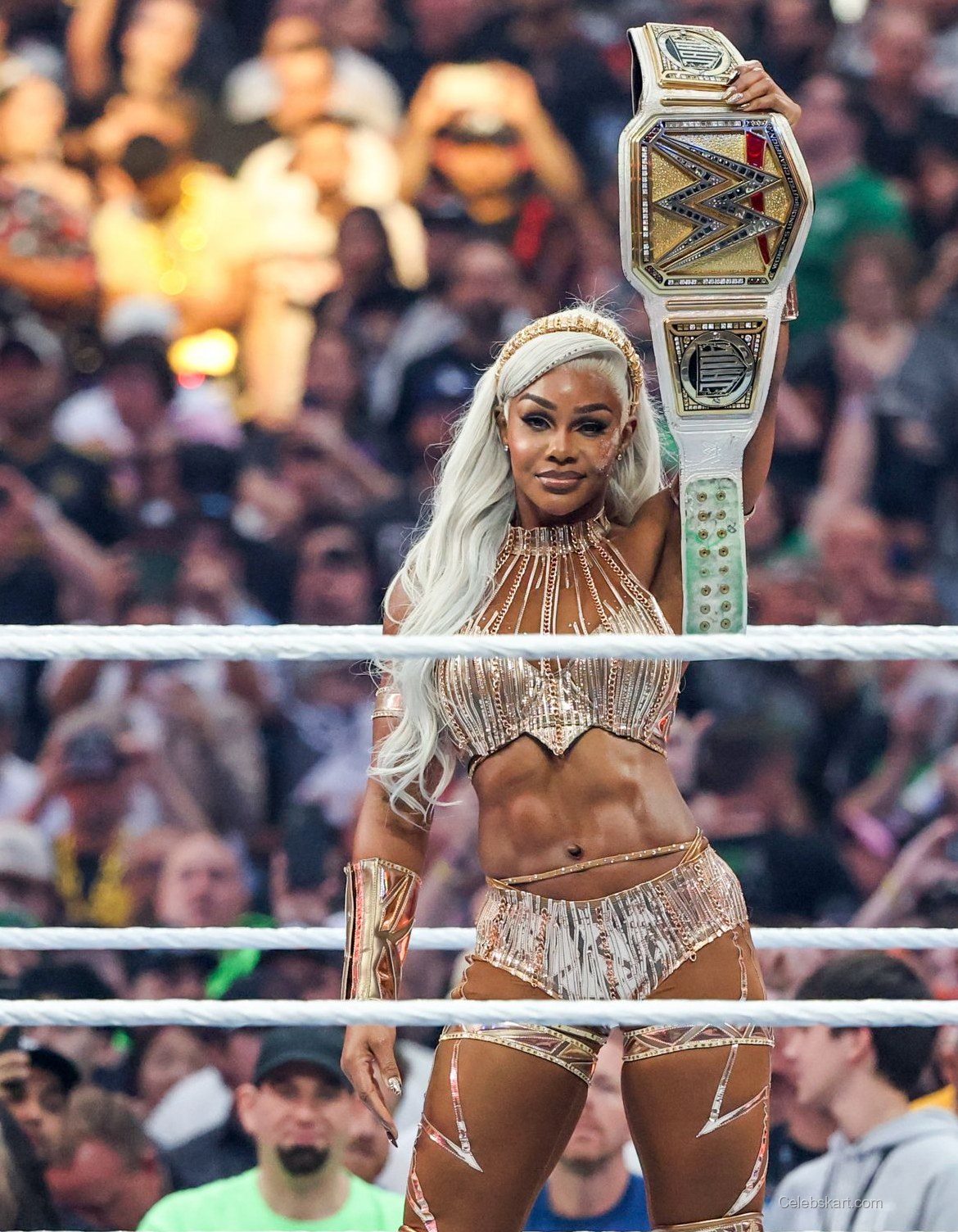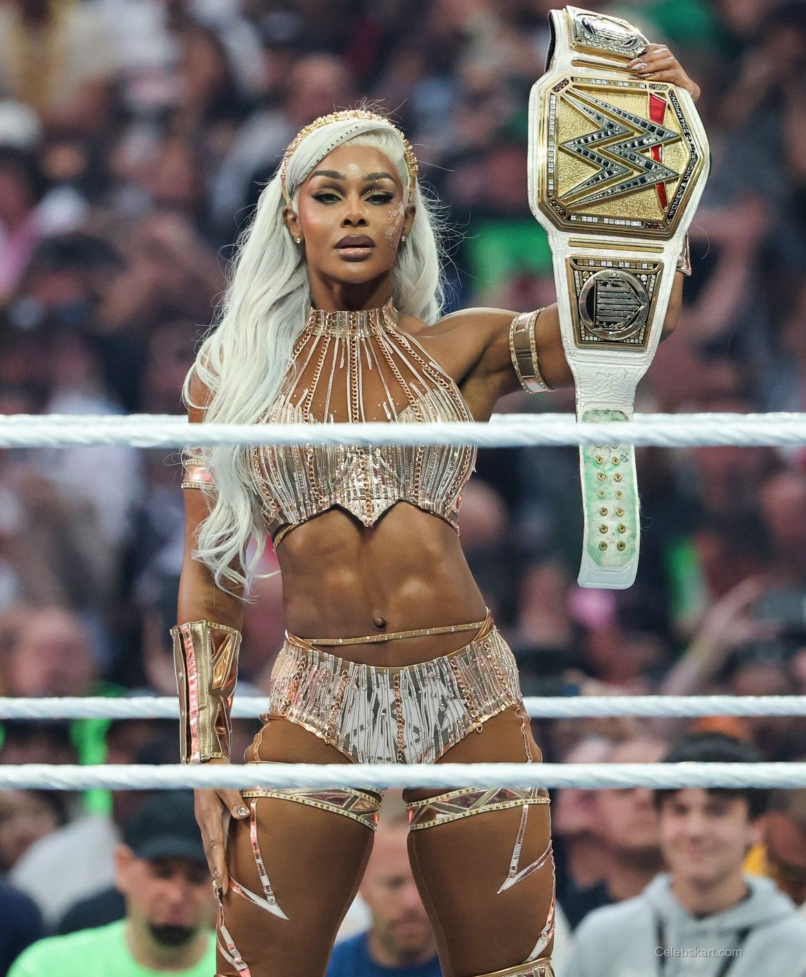 Jade wore a dazzling gold ensemble that accentuated her athletic physique. The outfit featured intricate detailing and a fitted design that highlighted her toned midriff. She paired the look with matching accessories, including gold arm cuffs and a belt. The shimmering fabric of her outfit glimmered under the arena lights, creating a mesmerizing effect as she moved around the ring. The combination of gold hues and bold design elements made her stand out in the crowd, and it was a perfect choice for such a grand event.