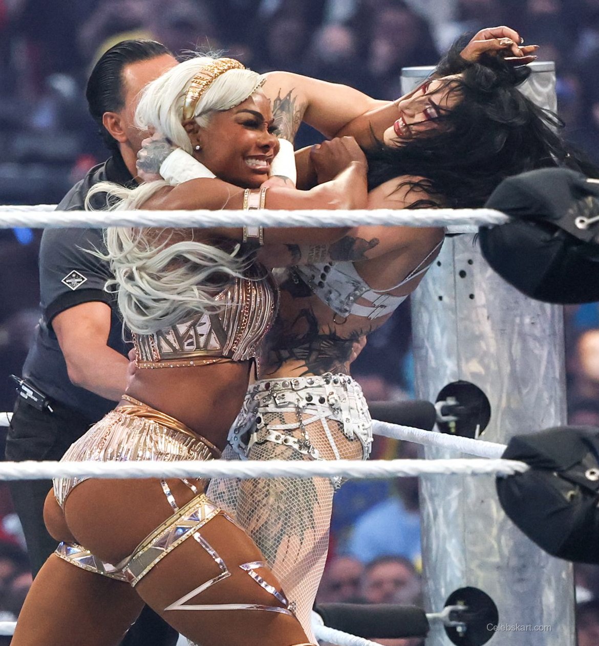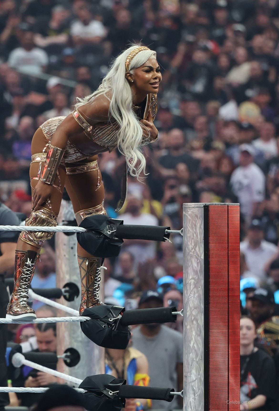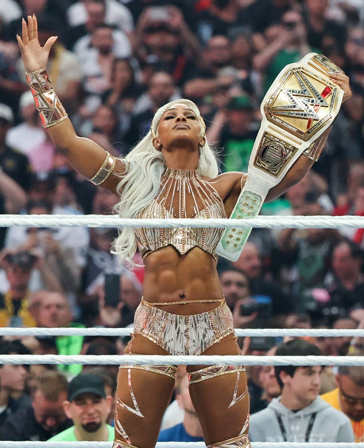 Jade wore a dazzling gold ensemble that accentuated her athletic physique. The outfit featured intricate detailing and a fitted design that highlighted her toned midriff. She paired the look with matching accessories, including gold arm cuffs and a belt. The shimmering fabric of her outfit glimmered under the arena lights, creating a mesmerizing effect as she moved around the ring. The combination of gold hues and bold design elements made her stand out in the crowd, and it was a perfect choice for such a grand event.