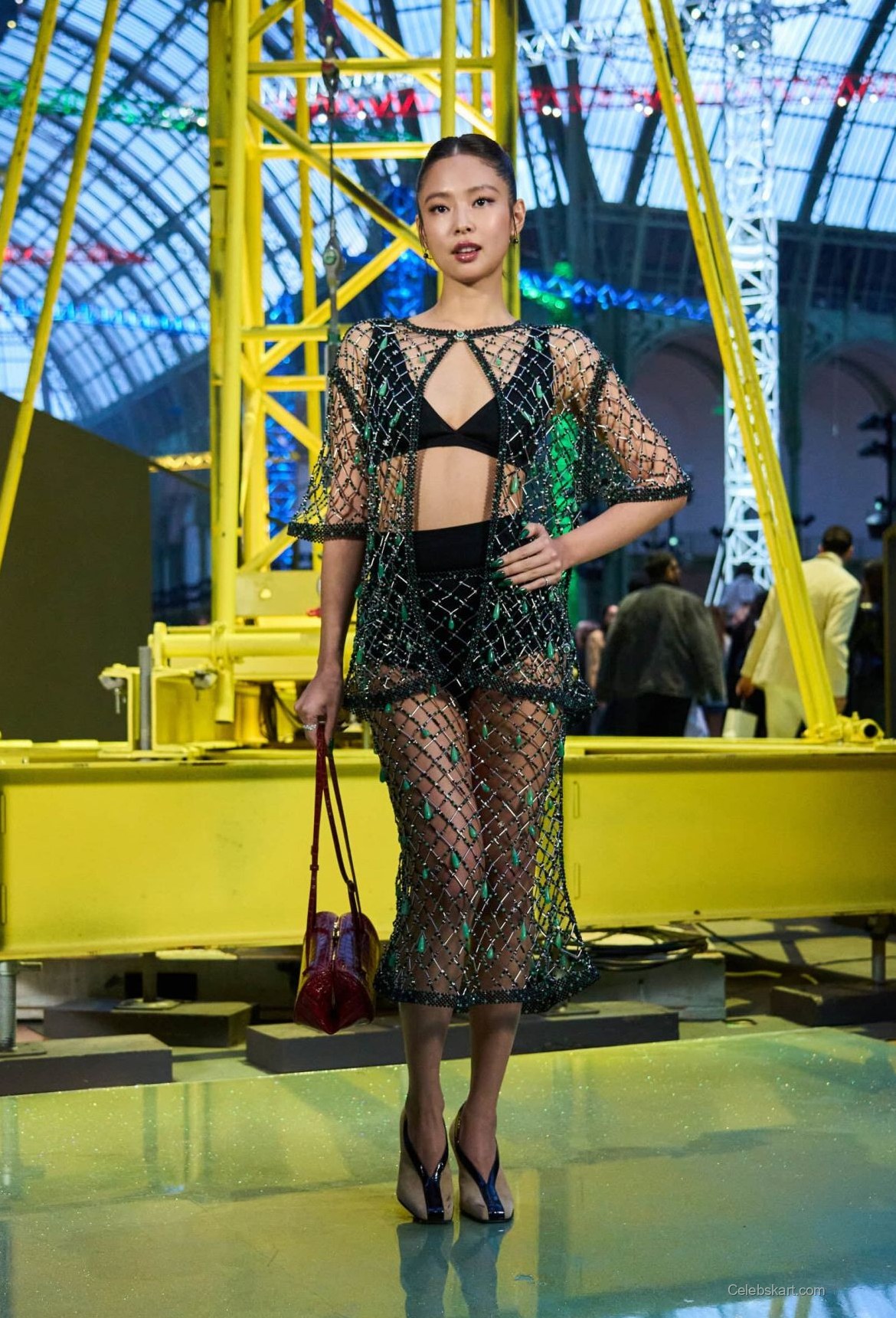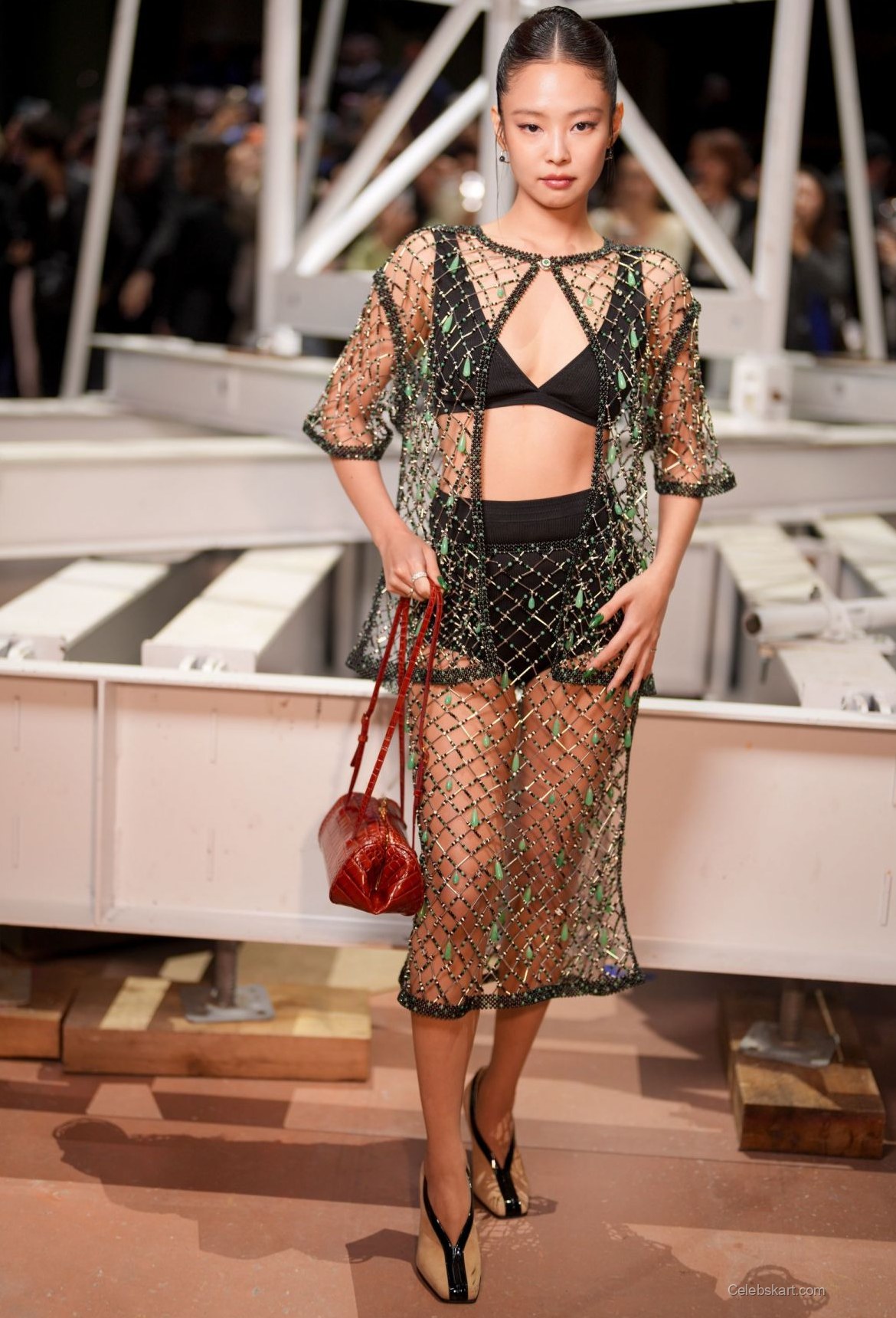 The outfit Jennie donned was a striking sheer ensemble adorned with intricate beadwork and vibrant green accents. The sheer material highlighted her figure beautifully, allowing the play of light to dance on her skin. Paired with a simple yet elegant black bikini top, the ensemble was both bold and refined, perfectly capturing the essence of Chanel. The choice of black and green added depth, making her stand out against the dynamic backdrop of the event.