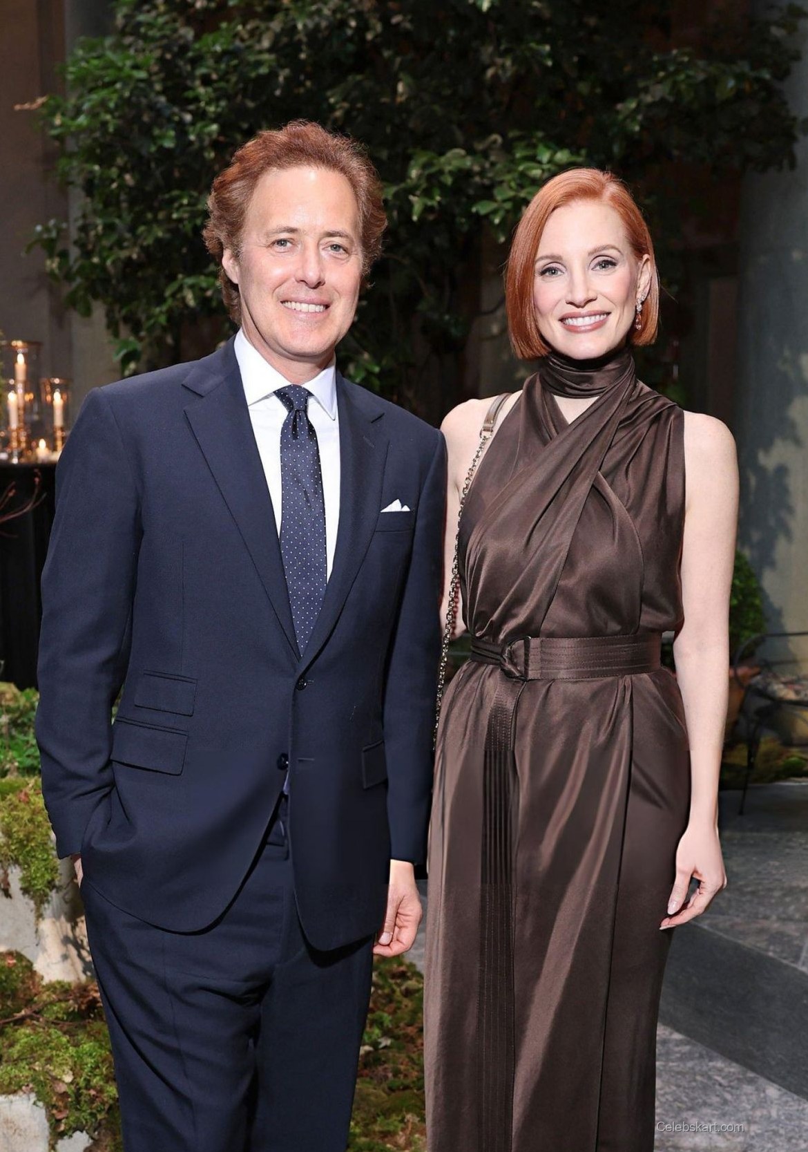 Wearing a stunning brown dress that hugged her figure perfectly, Jessica Chastain showcased a unique design that featured a high neckline and intricate draping. The dress, made from a luxurious satin fabric, had a silky sheen that caught the light beautifully, enhancing the rich color of the garment. The outfit was cinched at the waist with a matching belt, accentuating her silhouette while adding a touch of refinement. Her overall look was completed with elegant accessories, including a delicate chain-strap handbag and sparkling earrings that added just the right amount of sparkle.