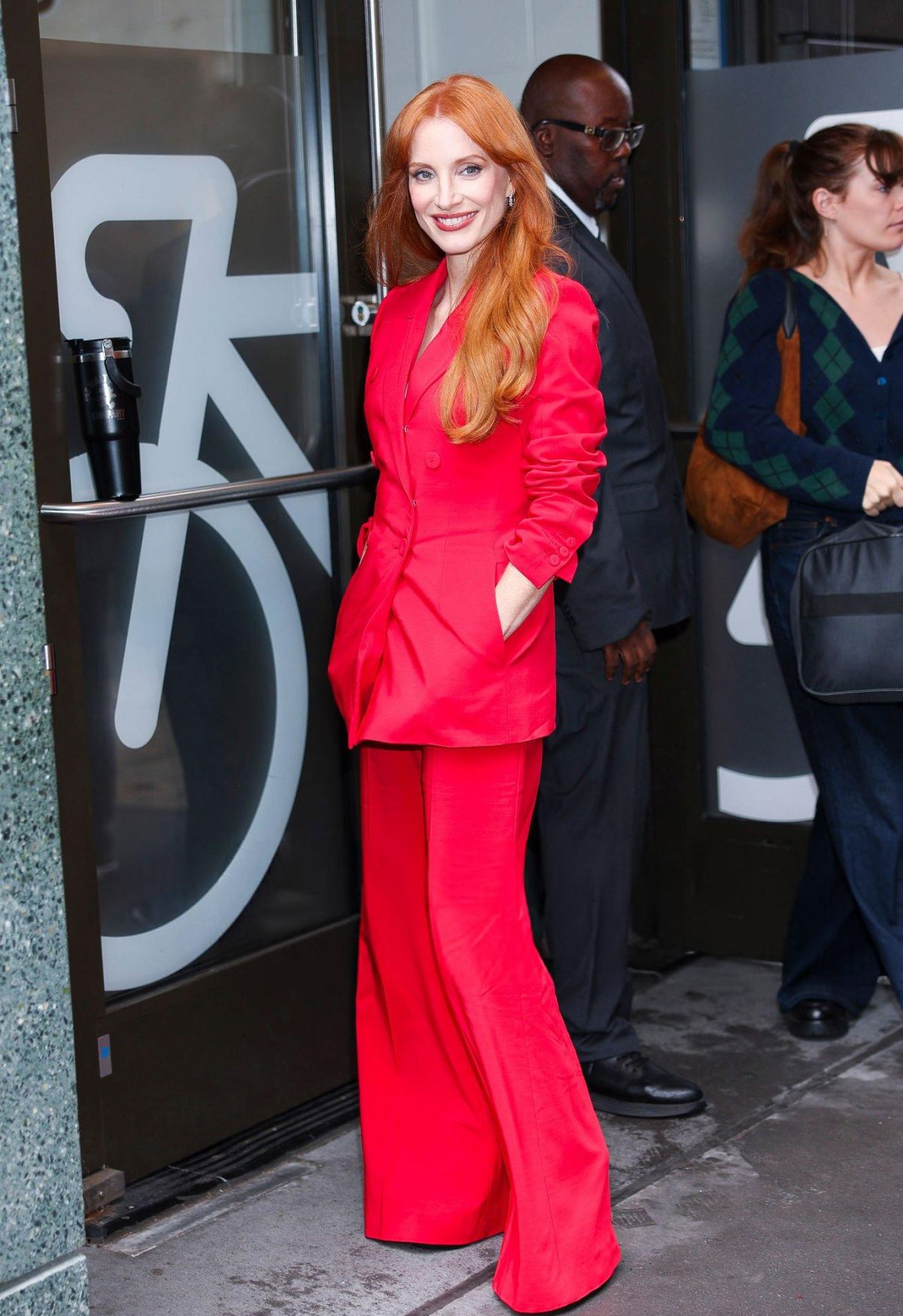 Jessica Chastain in green ensemble at ABC Studios NYC