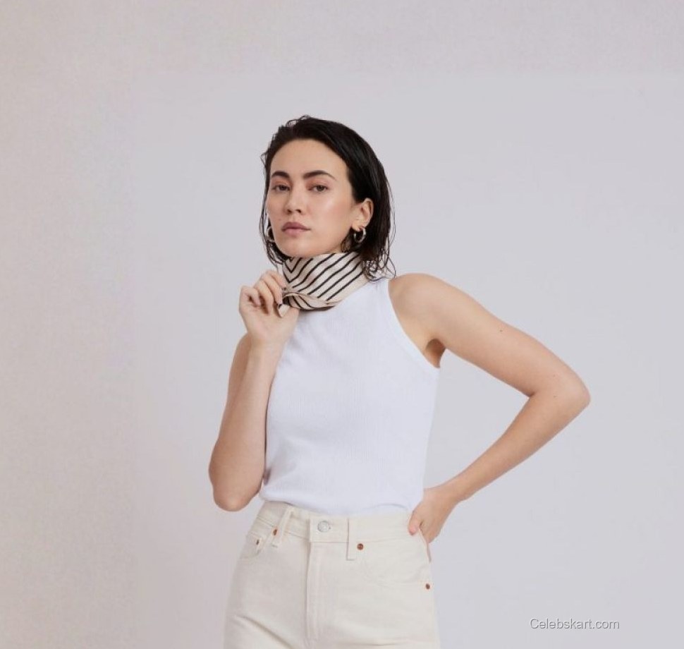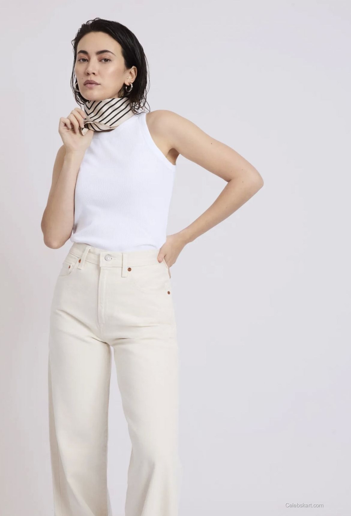 Jessica's outfit consists of a crisp white ribbed tank top paired with high-waisted cream trousers. The simplicity of the white top highlights her radiant skin and enhances her overall look. Completing this ensemble is a striped silk scarf, elegantly tied around her neck, adding a touch of sophistication. The contrasting colors of the scarf and pants create a harmonious visual that draws attention.