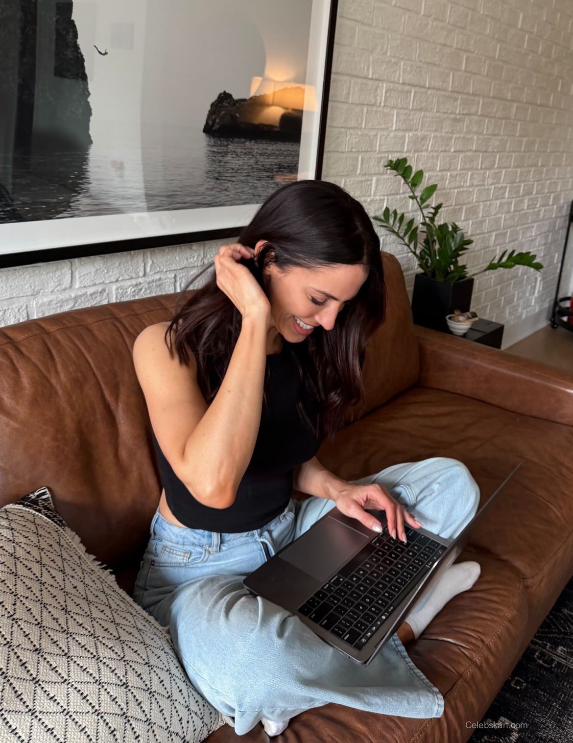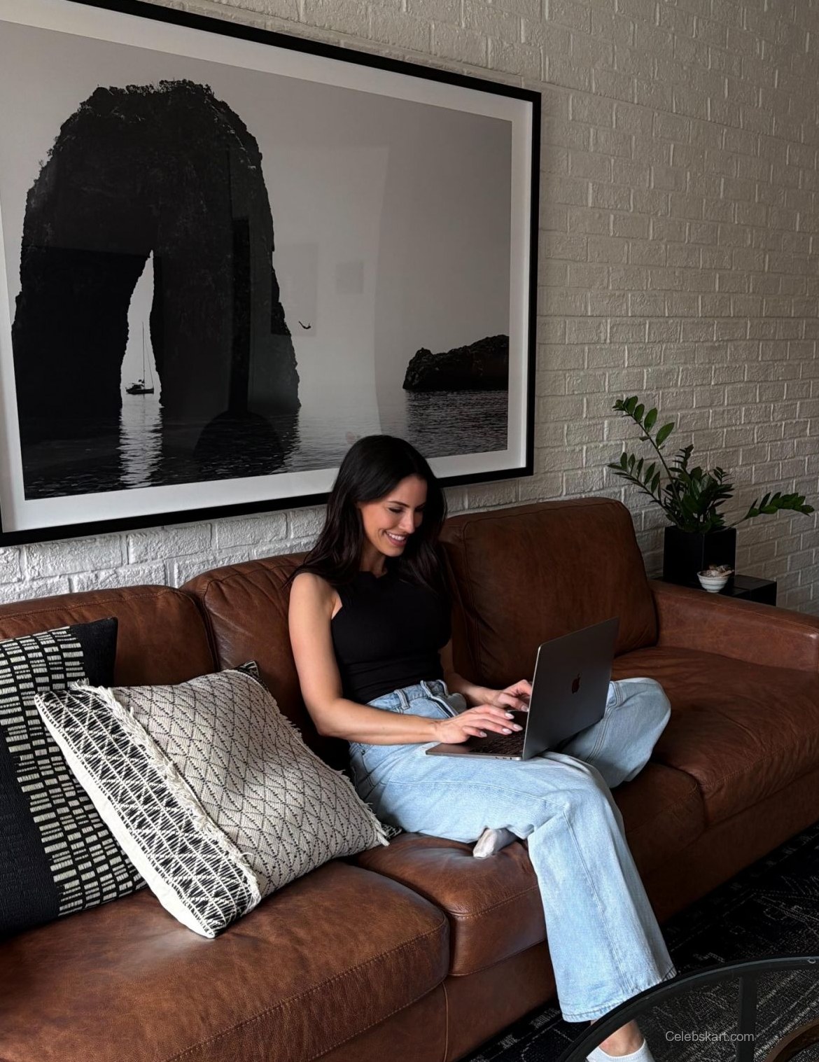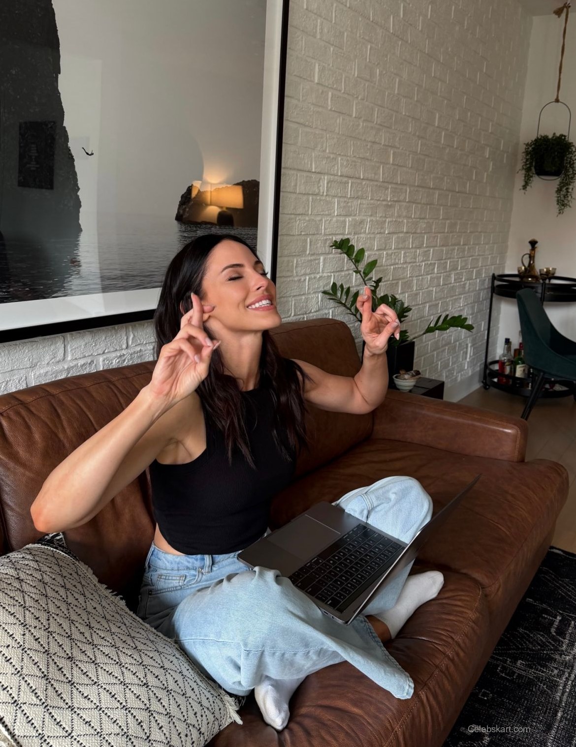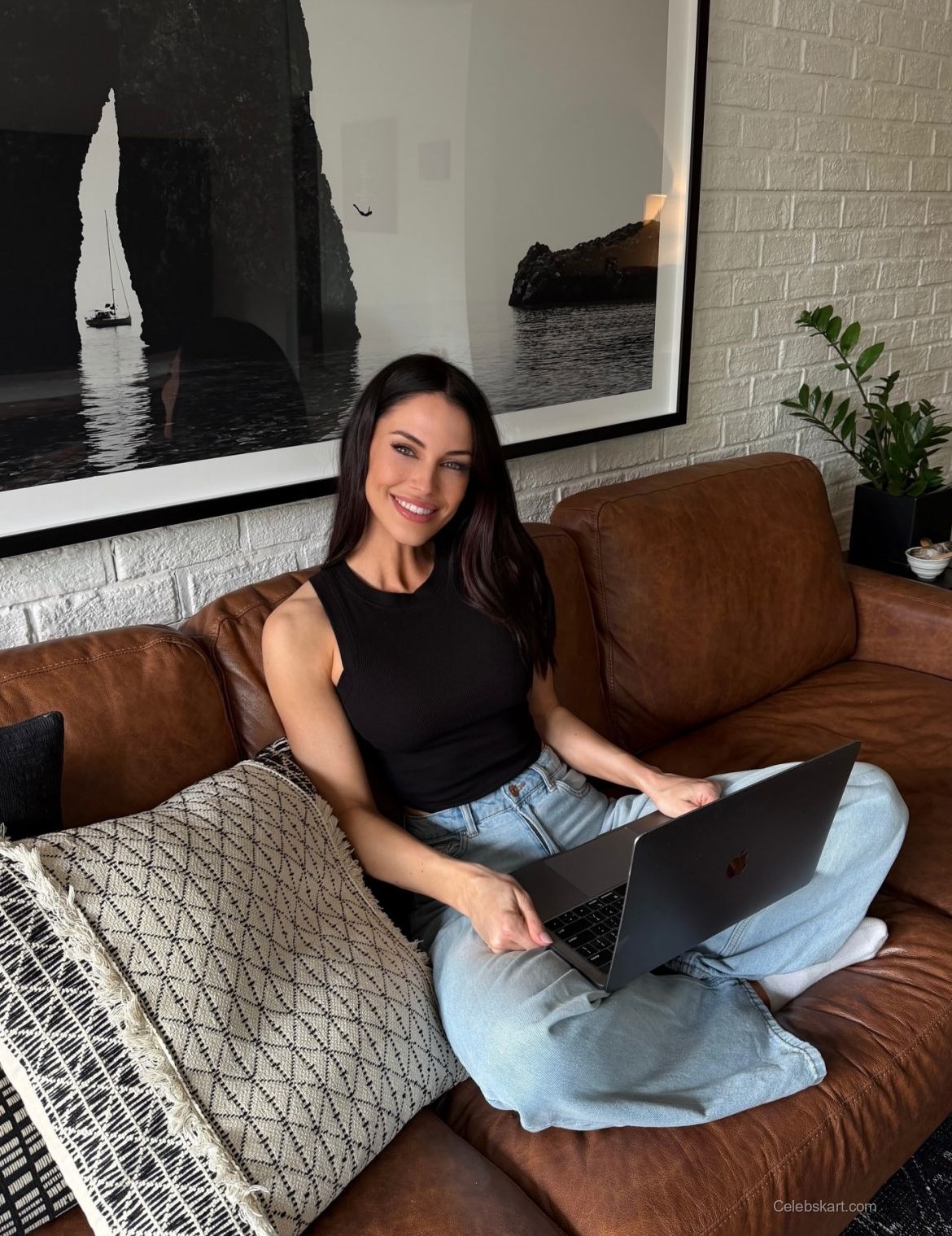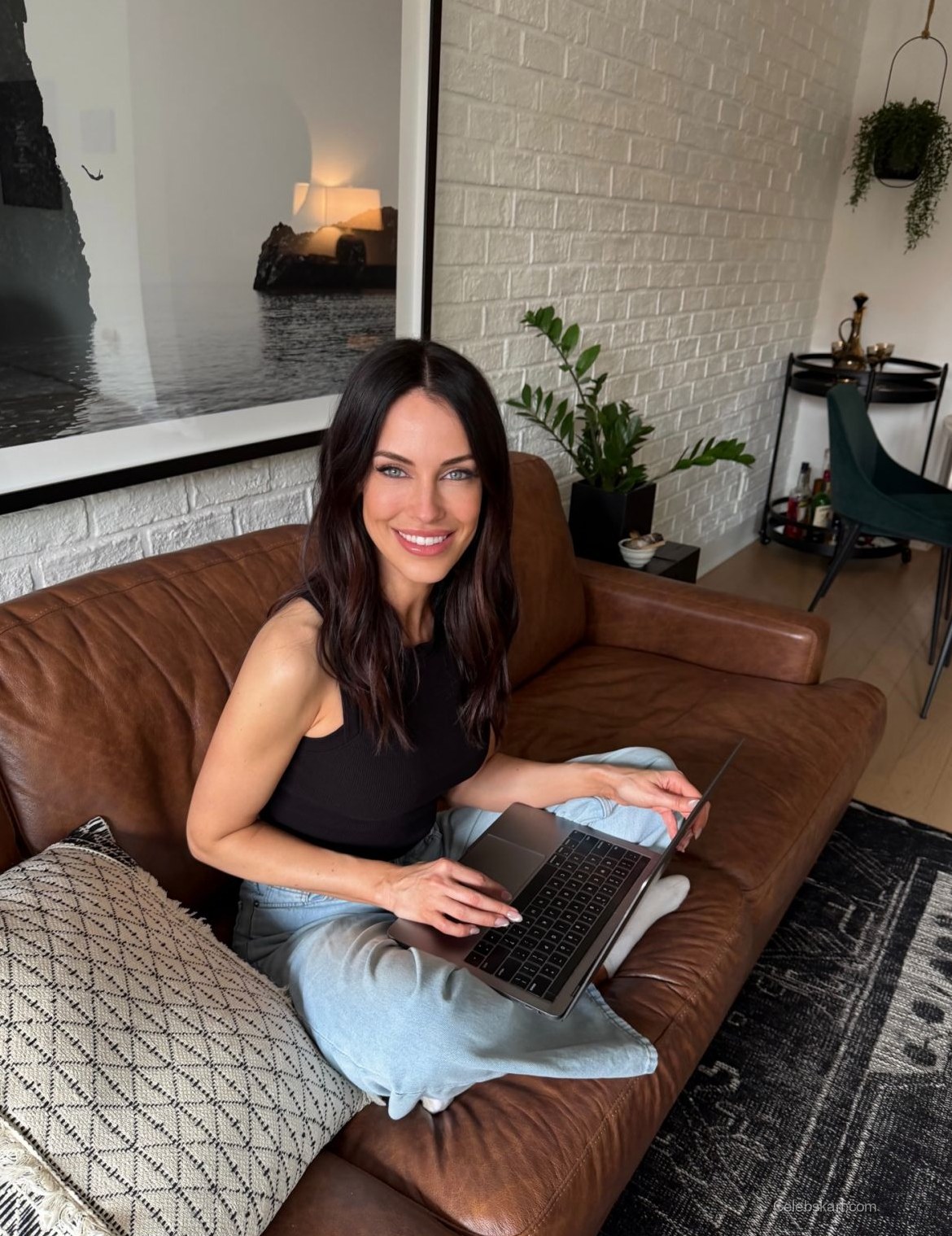 During her recent at-home photo session, Jessica Lowndes sported a trendy casual outfit. She paired a fitted black tank top with light blue jeans. The comfortable look was perfect for her indoor setting. Jessica was seated on a brown leather sofa, creating a relaxed scene. Her choice of clothing reflected a laid-back vibe suitable for a home environment.