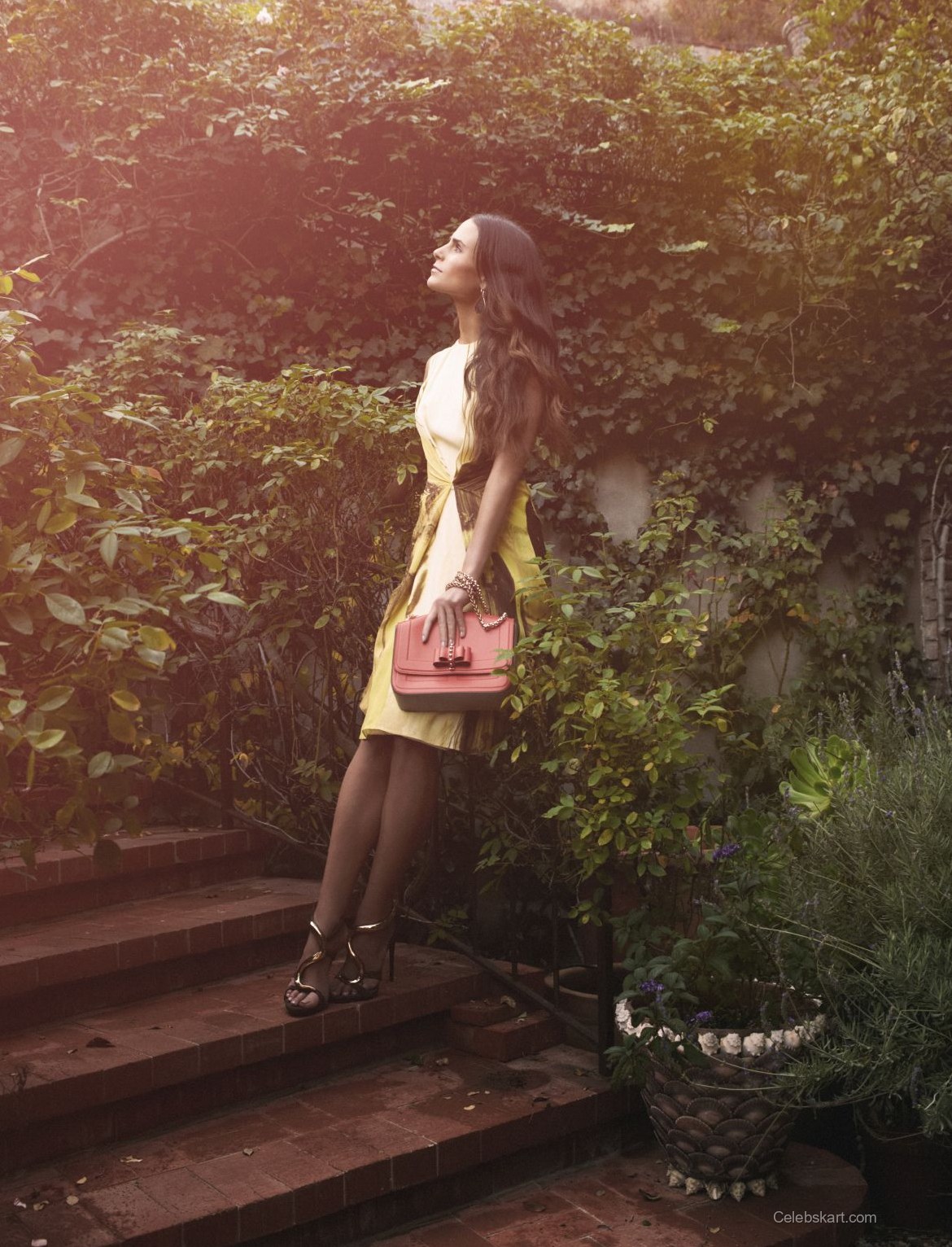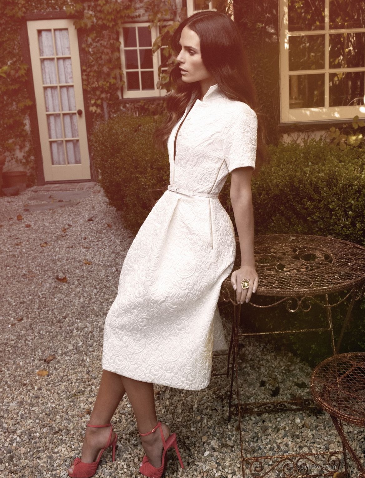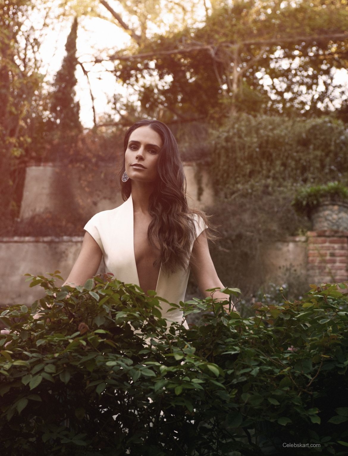 In one moment, Jordana posed against a backdrop of lush greenery, with sunlight filtering through the leaves, creating a soft halo around her. Her hair cascaded in gentle waves, framing her face beautifully. She held one hand thoughtfully near her chin, accentuating her features and inviting the viewer to connect with her gaze. Another shot captured her adjusting her dress, a natural action that showcases her comfort and confidence within the fashion narrative.