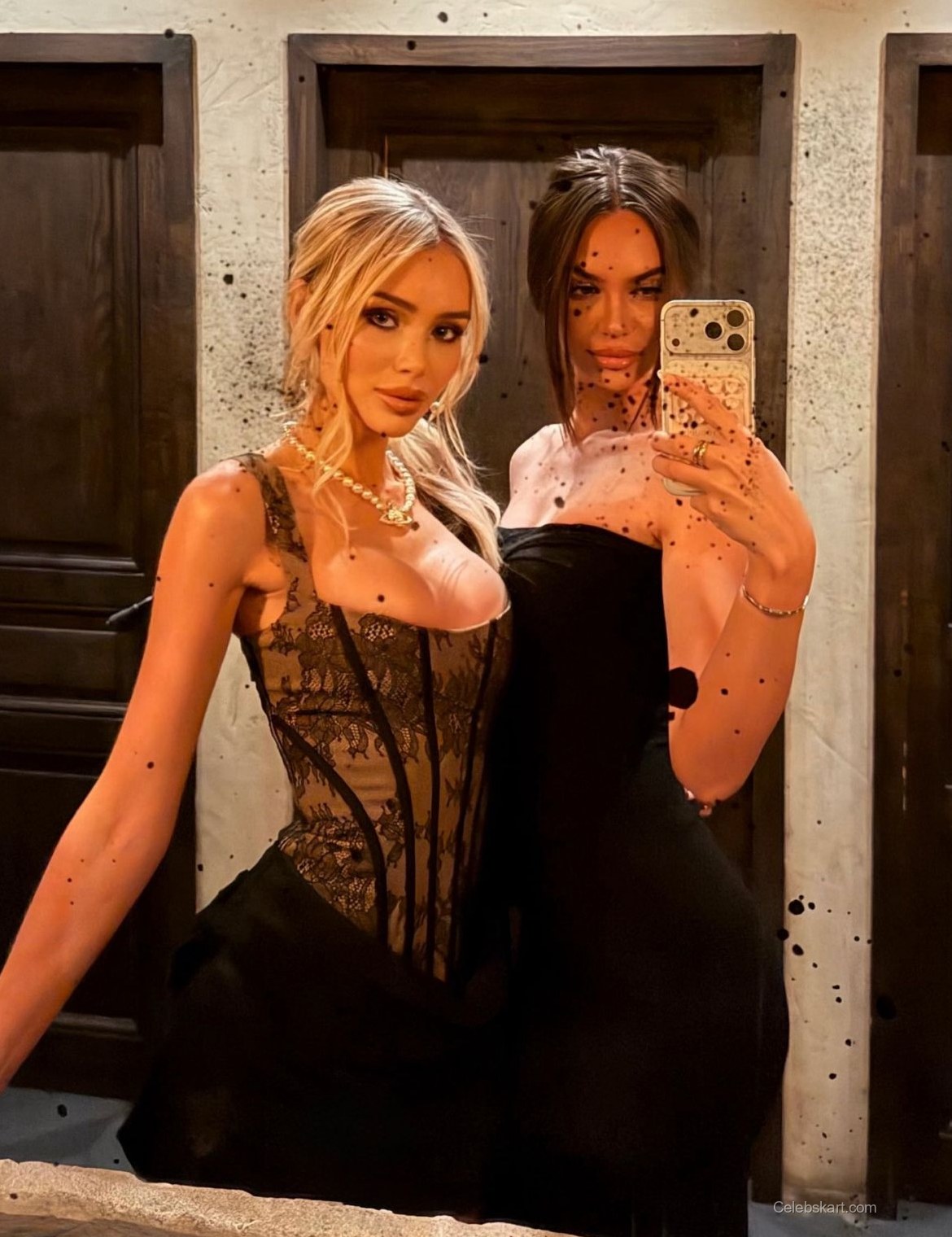 Julia can be seen engaging with her surroundings and interacting with her friends, who are also dressed in elegant outfits. The warm lighting at the event creates an inviting ambiance, making her and the setting lively. Notably, she holds a small plate with a heart design while sitting at a beautifully set table, filled with glasses and cutlery, further showcasing her playful yet stylish persona. This moment perfectly encapsulates her ability to blend fun with fashion.