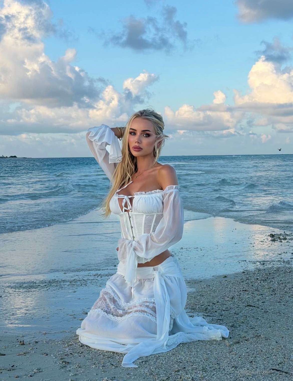 Wearing a delicate white corset, Julia’s style emphasizes her figure while providing a touch of elegance. The garment features intricate lace details and buttons that catch the light beautifully. Complementing the corset, she pairs it with a light, airy skirt that flows with the wind and adds movement to her ensemble. The soft fabric drapes around her legs, revealing her toned silhouette and creating a striking contrast against the backdrop of the ocean.
