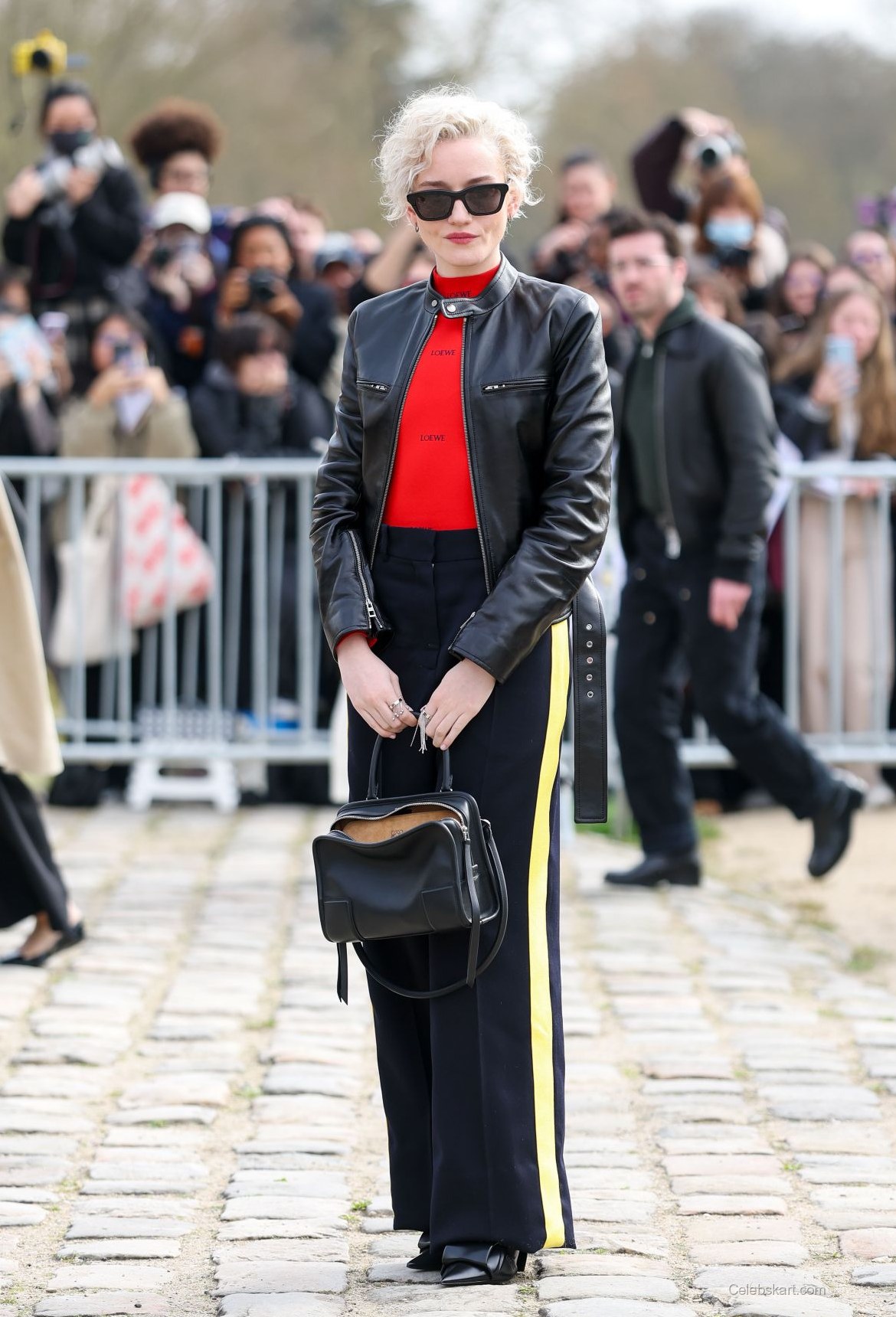 The bright red top was emblazoned with the Loewe logo, creating a cohesive look that stood out in the crowd. Below, she wore tailored black trousers adorned with eye-catching yellow stripes running down the sides. This combination not only highlighted her figure but also brought a touch of vibrancy to an otherwise classic color palette.