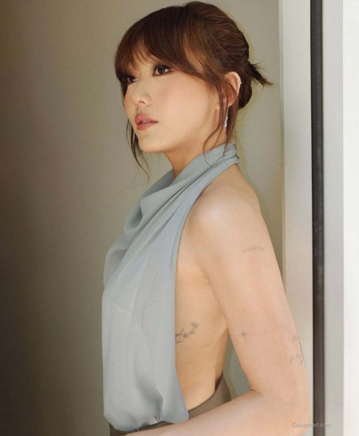 The focal point of Karen's look was her stunning outfit, characterized by a unique open-back design and flowing lines. The light blue drape accentuated her figure while maintaining an air of sophistication. The high neckline and minimalist silhouette highlighted her style without overwhelming the composition. The neutral brown accents provided an interesting contrast, allowing the ensemble to stand out even more. To see more of Karen's unique outfits, check out her latest looks.