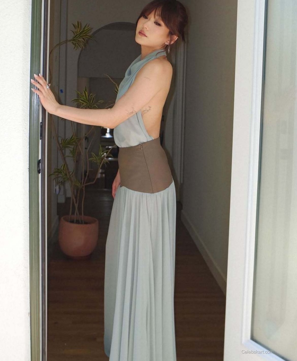 In a recent photoshoot, Karen posed gracefully against a sunlit doorway, highlighting her natural beauty. Her hair was styled in soft waves, framing her face and accentuating her subtle makeup, which featured earthy tones to enhance her features. The background, with hints of greenery, added a touch of freshness to the shoot. At another moment, she adjusted her hair, showcasing the details of her outfit and the elegant lines of her silhouette. Throughout the session, her confident demeanor was evident, reflecting her comfort in the stunning ensemble. Discover more about how she styled this look here.