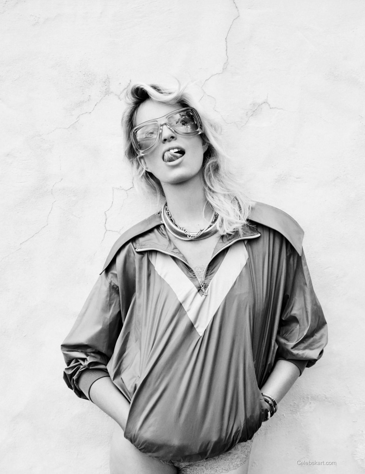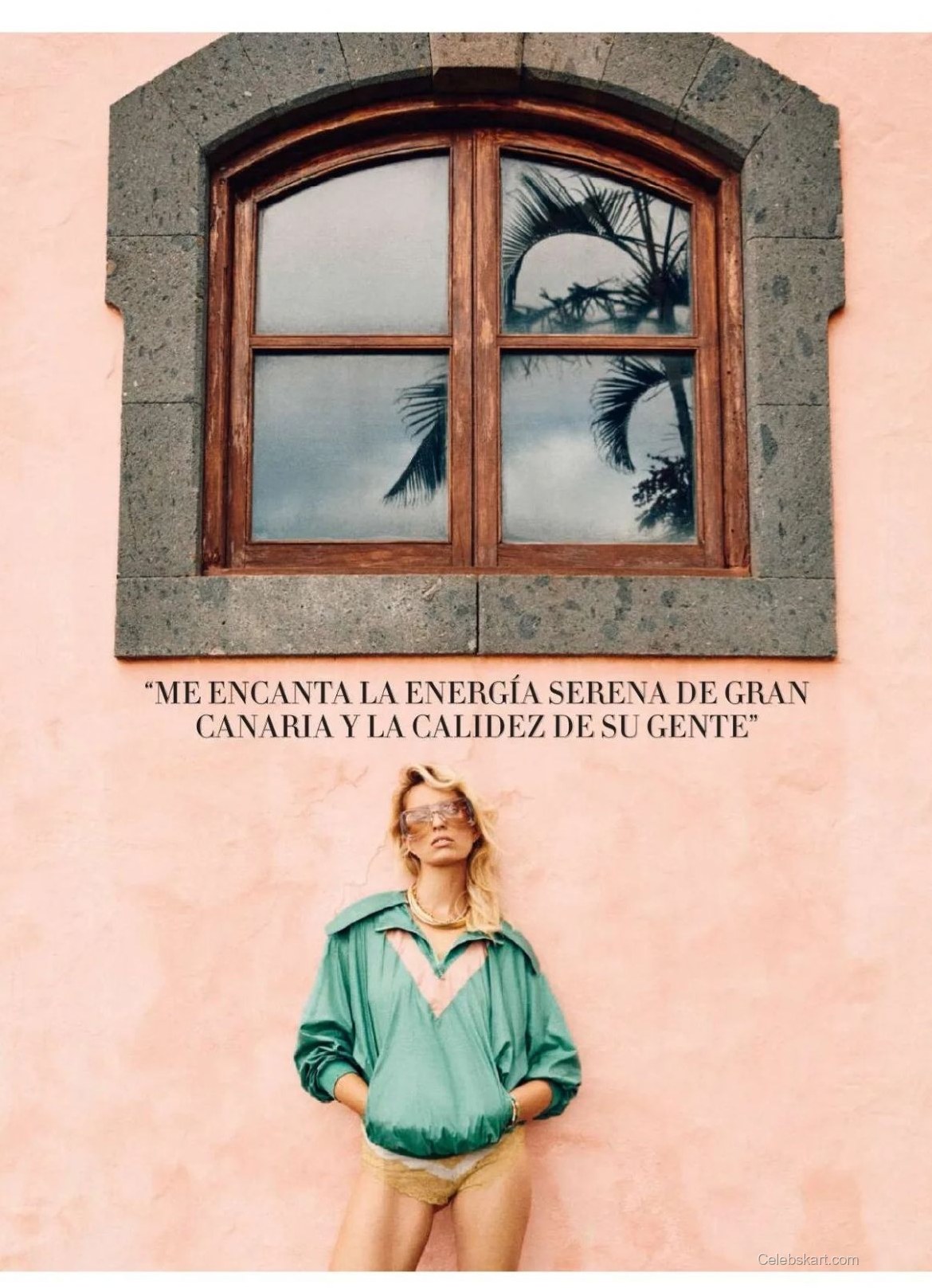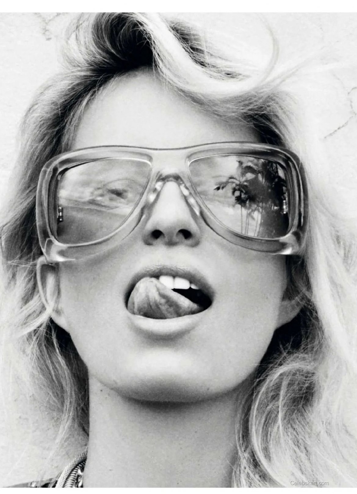 In this photoshoot, Kurkova’s pose is both relaxed and engaging. She playfully sticks her tongue out, injecting a sense of fun and spontaneity into the image. The background, a softly textured wall, contrasts beautifully with her light hair, drawing attention to her expressive features. The overall composition radiates a sense of freedom and individuality.