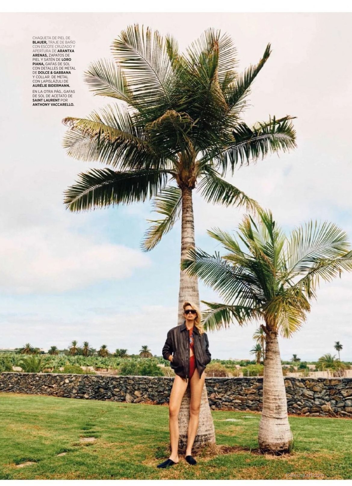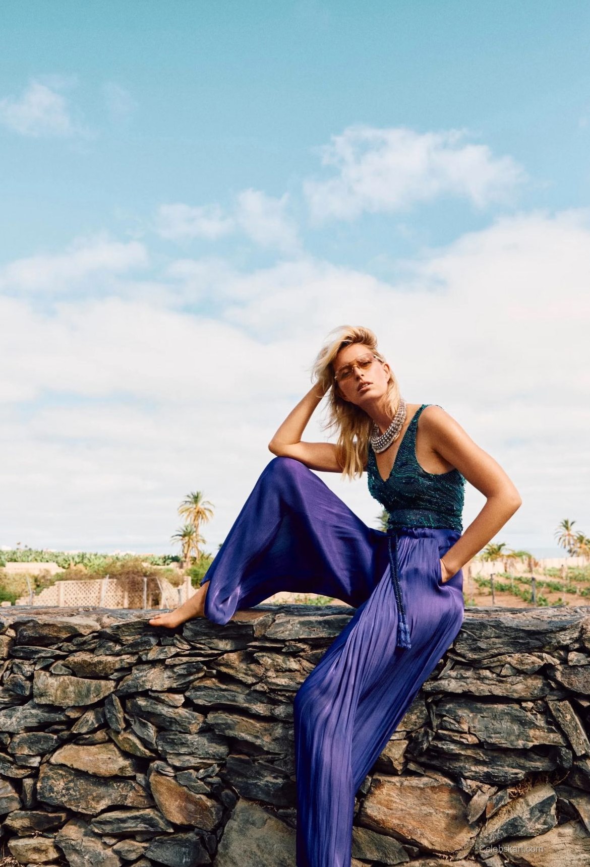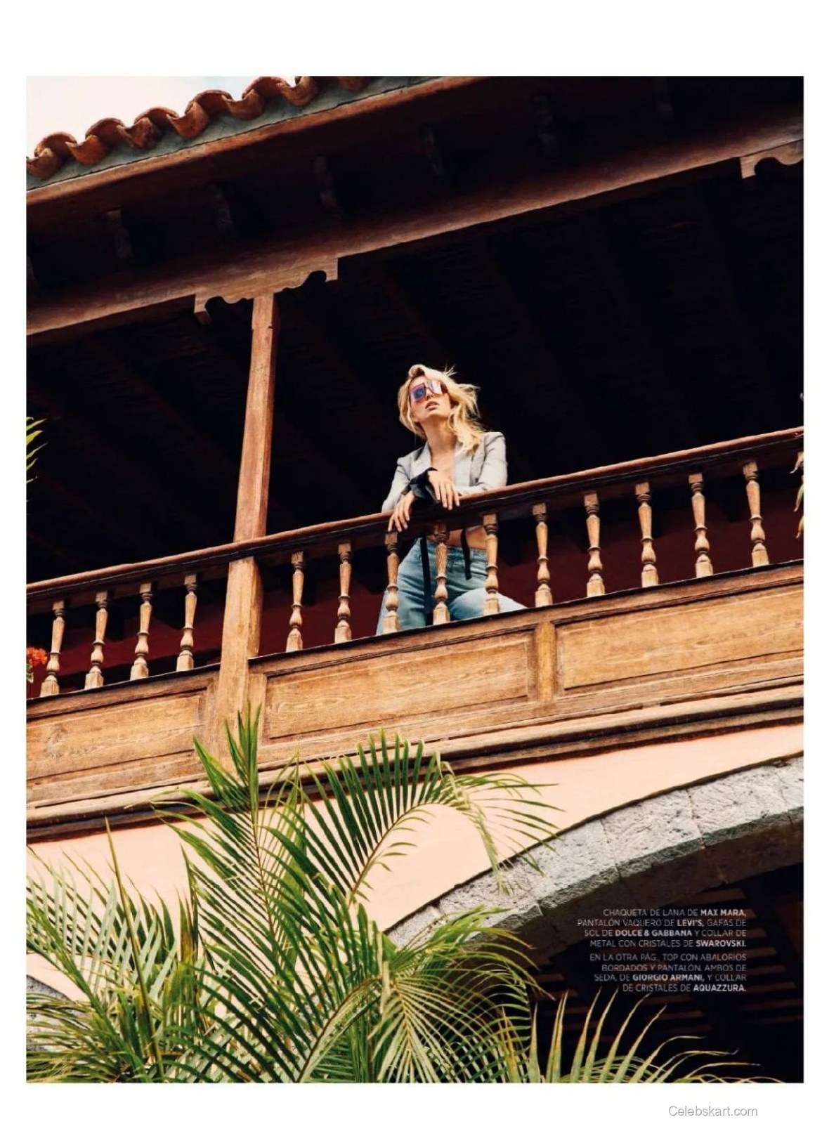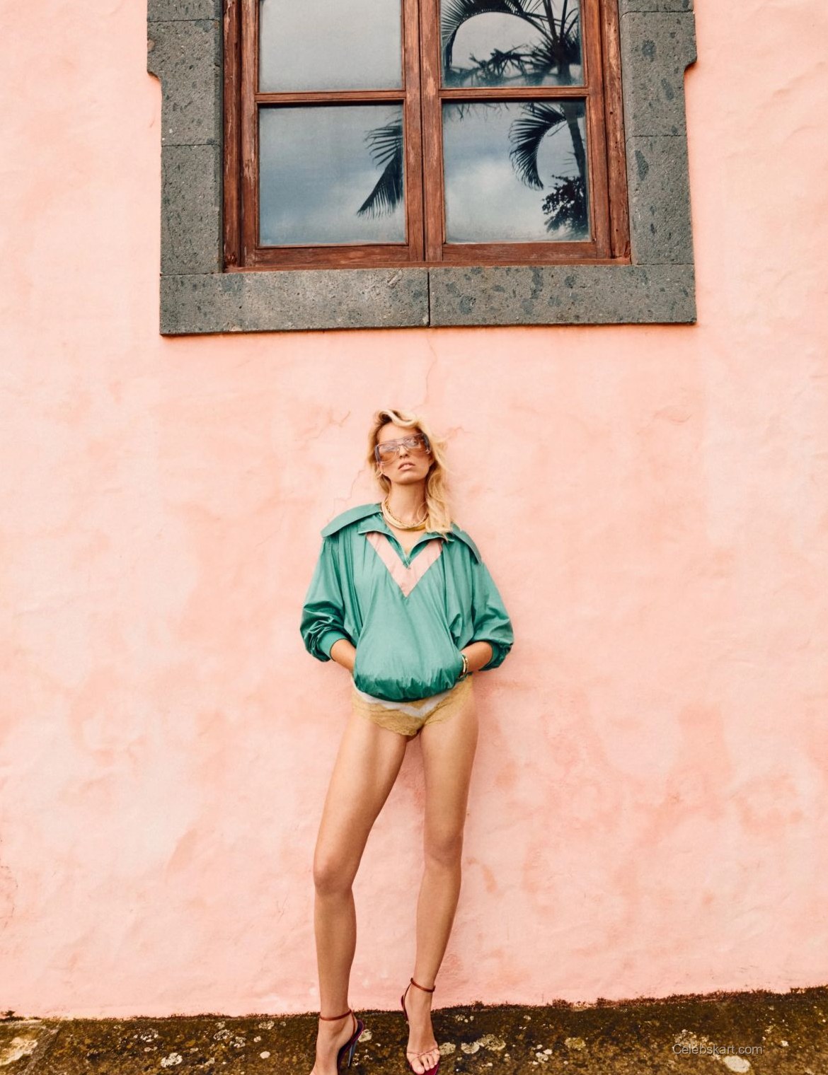 In this photoshoot, Kurkova’s pose is both relaxed and engaging. She playfully sticks her tongue out, injecting a sense of fun and spontaneity into the image. The background, a softly textured wall, contrasts beautifully with her light hair, drawing attention to her expressive features. The overall composition radiates a sense of freedom and individuality.