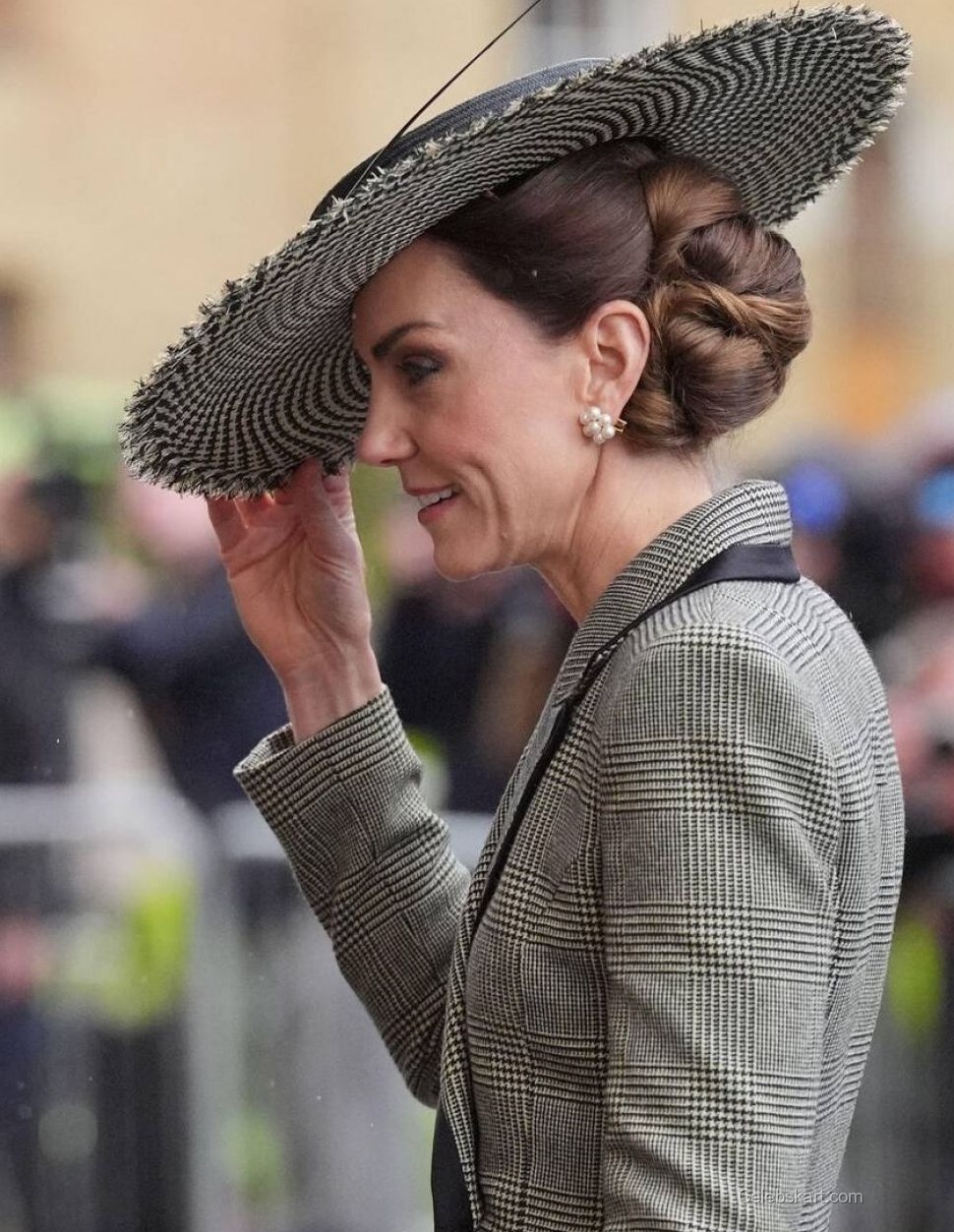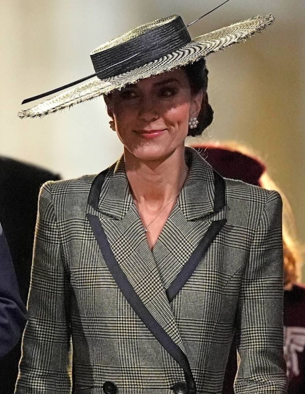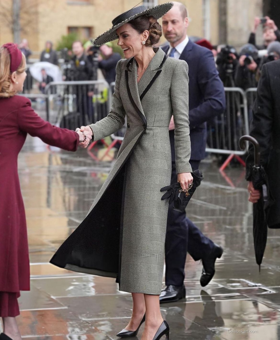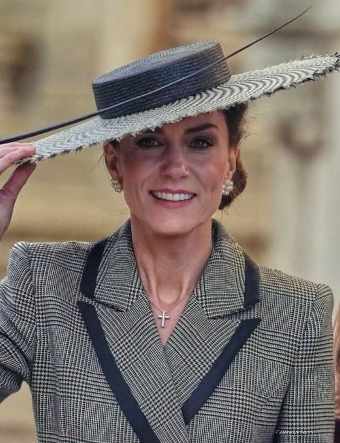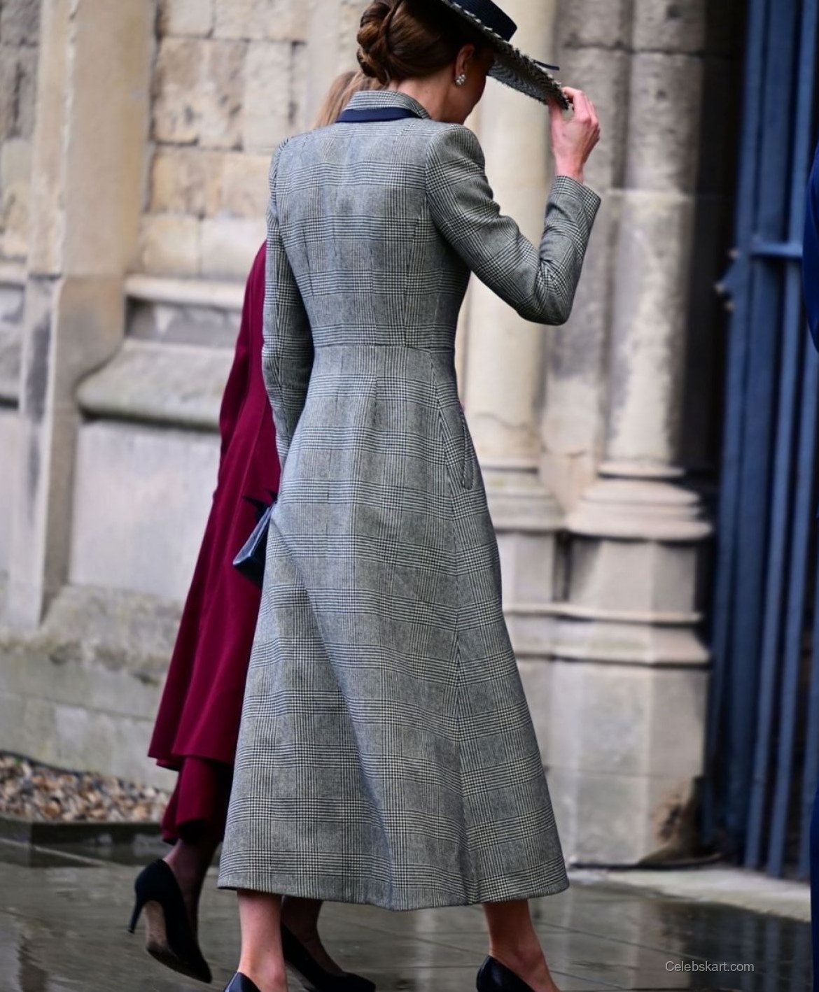 The outfit featured a tailored grey coat that hugged her silhouette, adorned with a subtle check pattern. Its structured design highlighted her figure, while the elongated cut added a touch of class. Kate paired the coat with pointed black heels, further enhancing her elongated frame. Accessories played a significant role in her overall appearance; a wide-brimmed hat added a dramatic flair, featuring a black and white design that complemented her outfit beautifully. She accentuated her look with elegant pearl earrings and a fine cross necklace, balancing simplicity with sophistication.