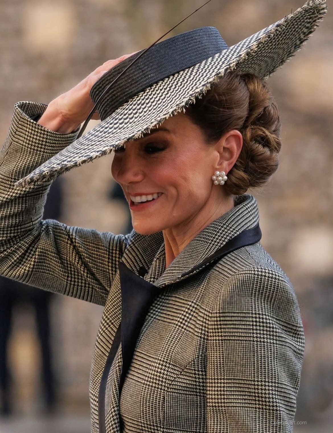 As she arrived at the event, Kate was seen gracefully adjusting her hat, a moment that showcased her poise. With a warm smile, she greeted the guests, embodying both royal charm and relatability. The backdrop of the event, combined with the cool weather, created an atmospheric scene that made her ensemble even more striking. Kate's hair was styled in a chic updo that provided a polished look, keeping the focus on her facial features and accessories.