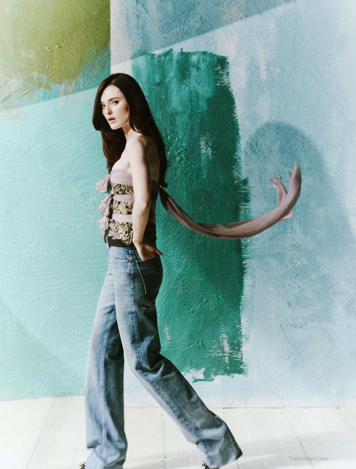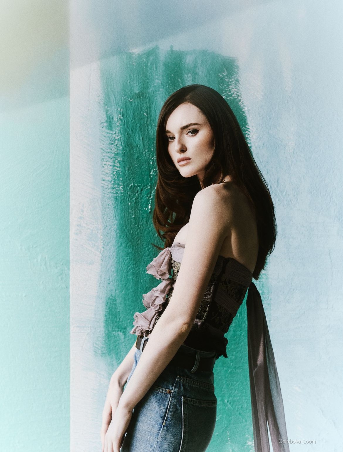 In this photoshoot, Katherine wears a stunning strapless top, adorned with intricate lace detailing and a flowing bow at the front. The soft, muted colors of her top beautifully complement her classic high-waisted jeans. Her look is completed with a sleek belt that accentuates her waist, making the outfit both stylish and sophisticated. You can explore more of Katherine’s celebrated fashion choices in the latest Katherine Devlin styles.