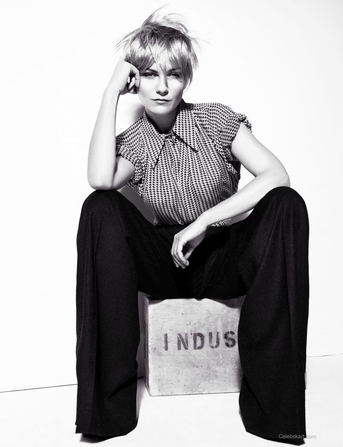 Kirsten opted for a striking black and white aesthetic throughout the shoot. Her outfits included a bold black leather skirt and a delicate black lace bra, layered under a fitted jacket. This combination highlighted her figure while juxtaposing soft and edgy elements. Additionally, the styling included sleek accessories that complemented the overall look.